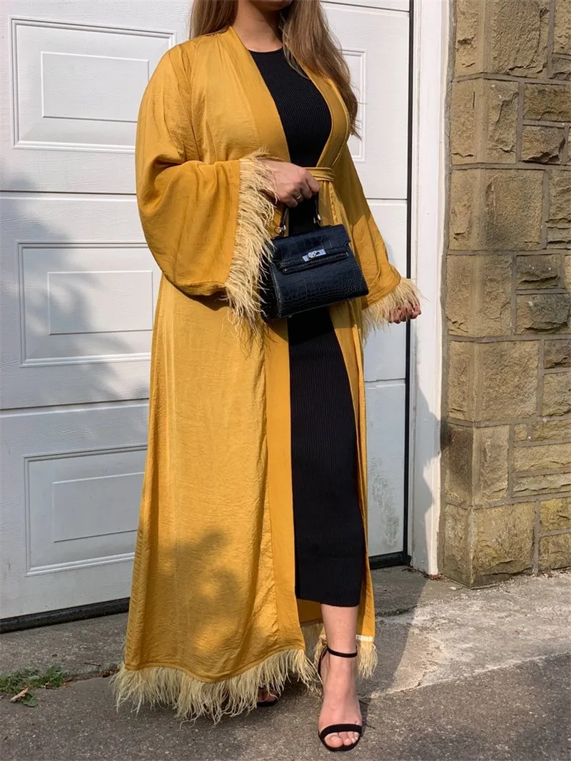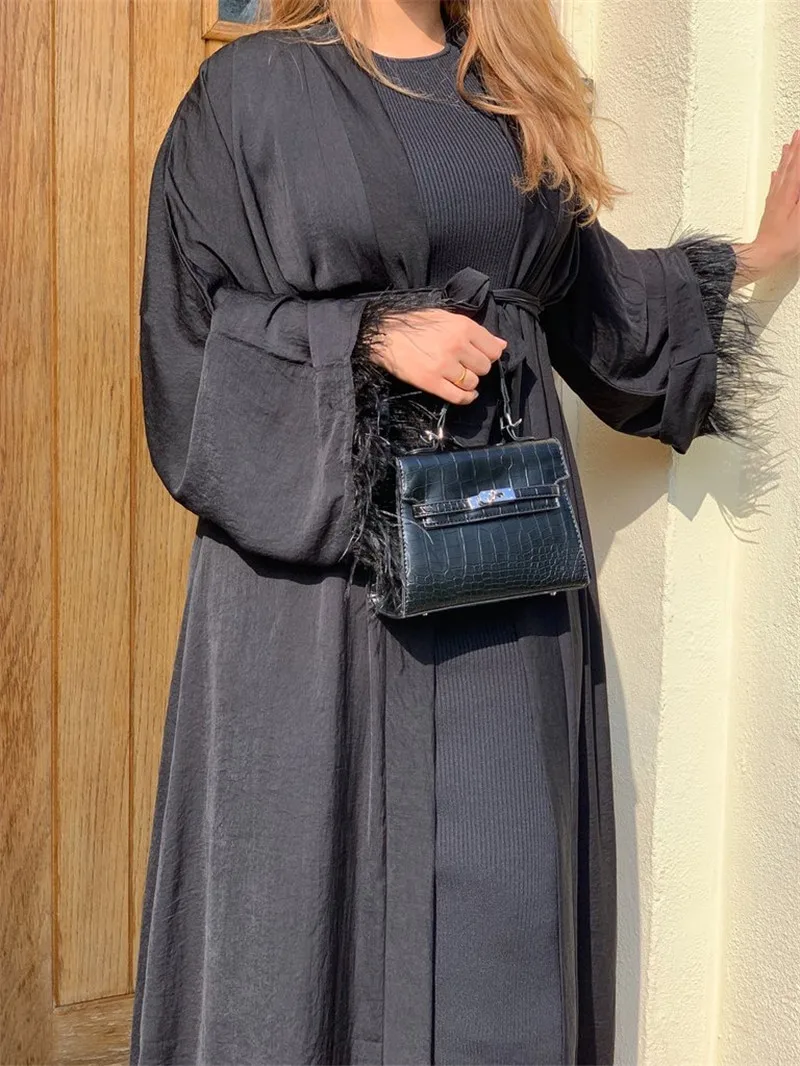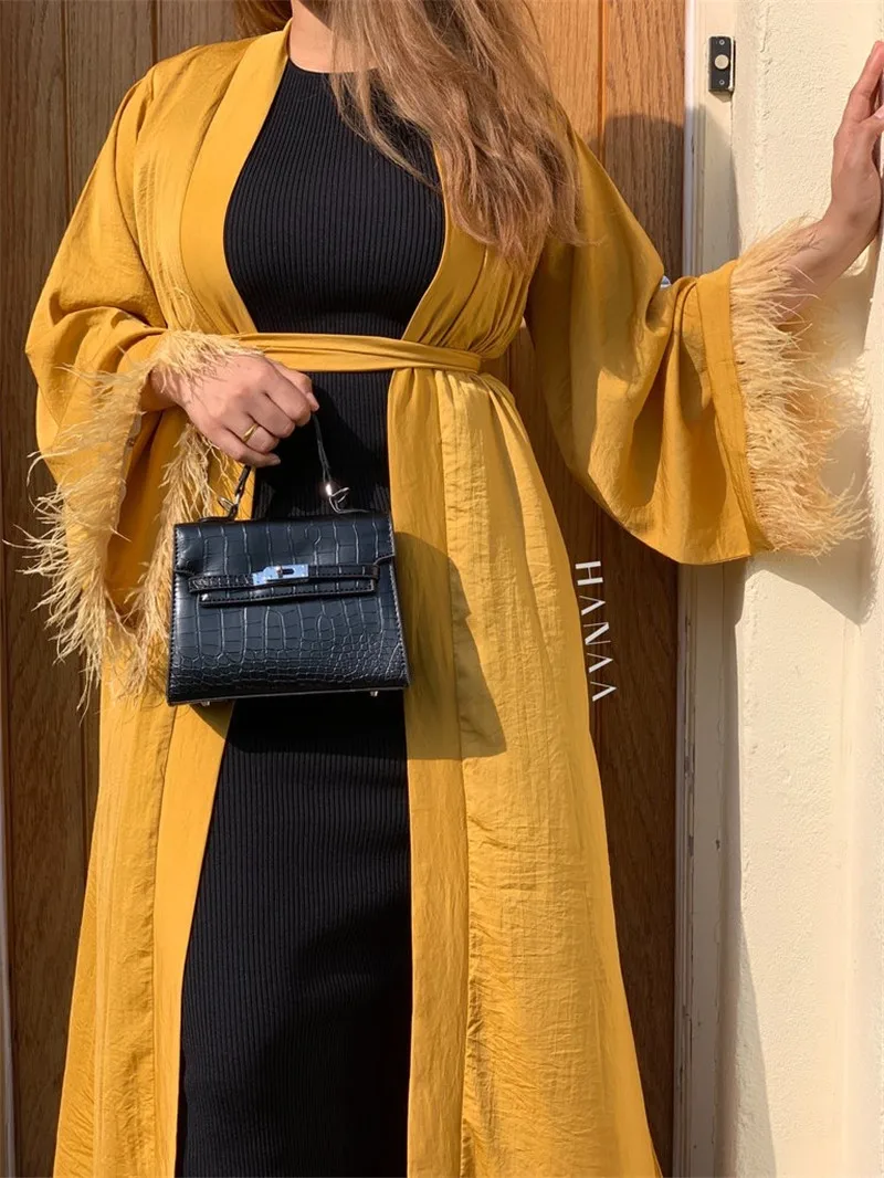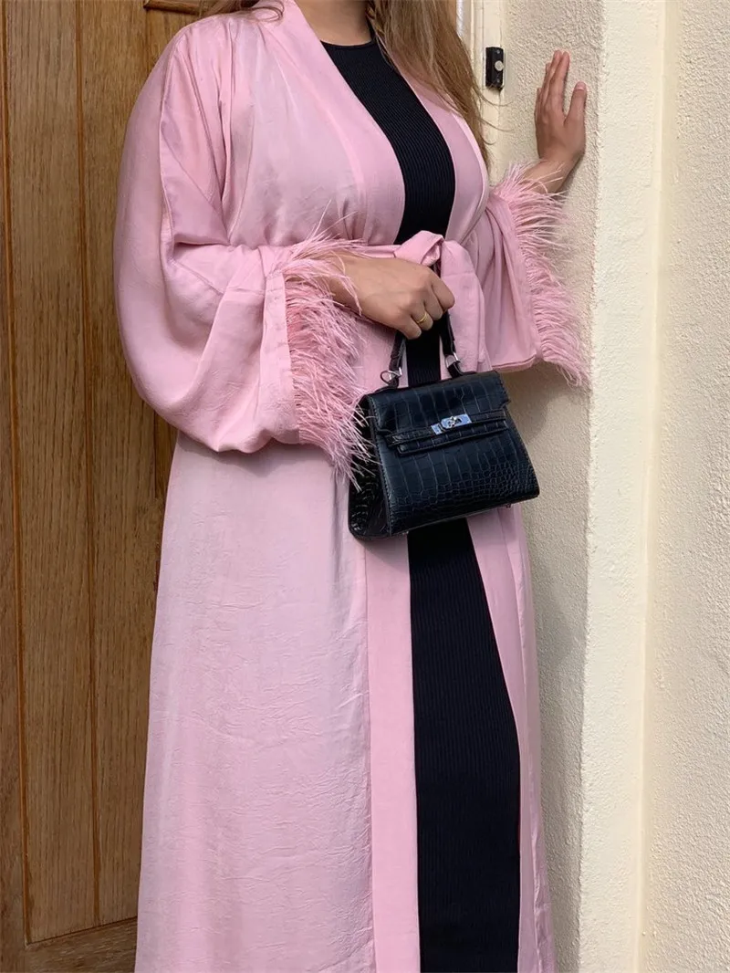 Maxi Dress Eid Djellaba Abaya Dubai Shiny Soft Silky Muslim Abaya Feather Stitching Muslim Dress Islam Abayas With Belt