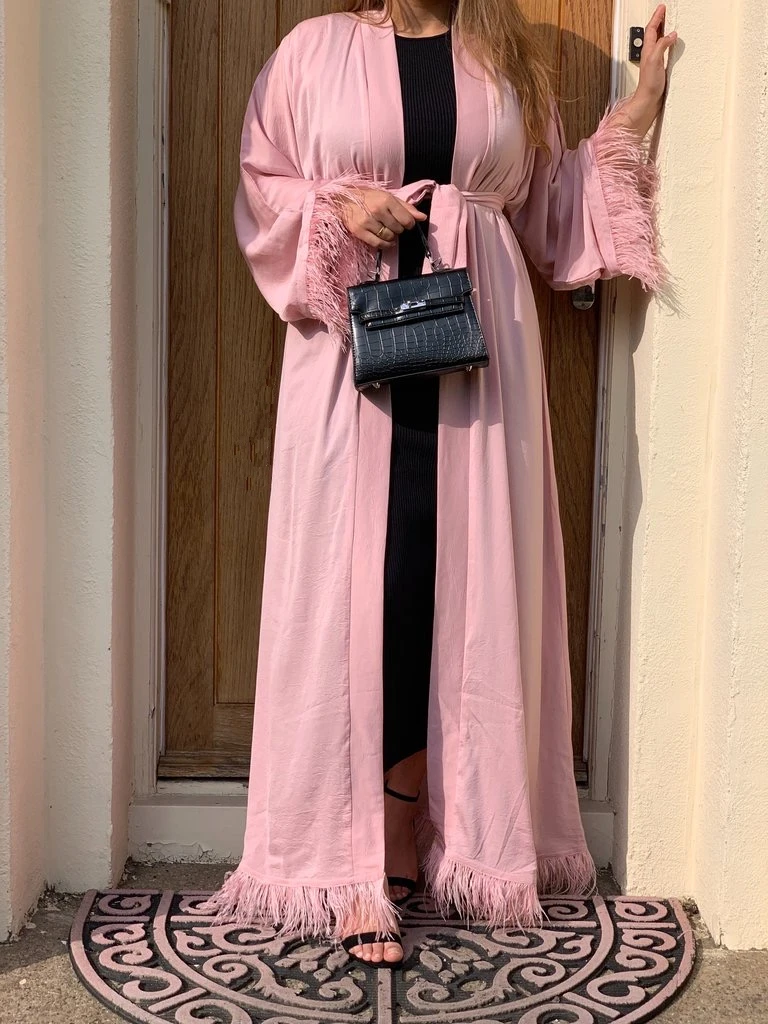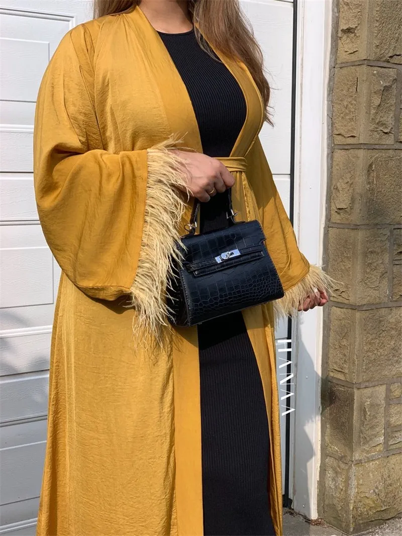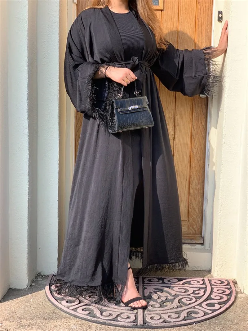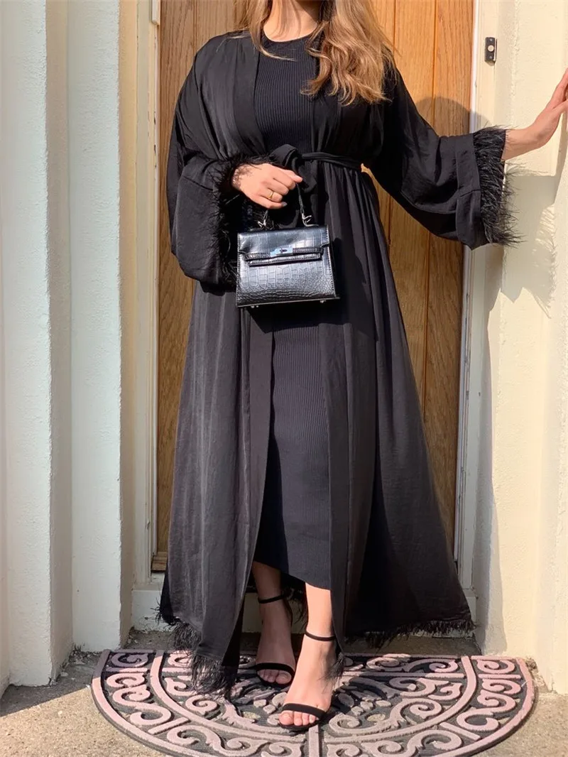 Maxi Dress Eid Djellaba Abaya Dubai Shiny Soft Silky Muslim Abaya Feather Stitching Muslim Dress Islam Abayas With Belt