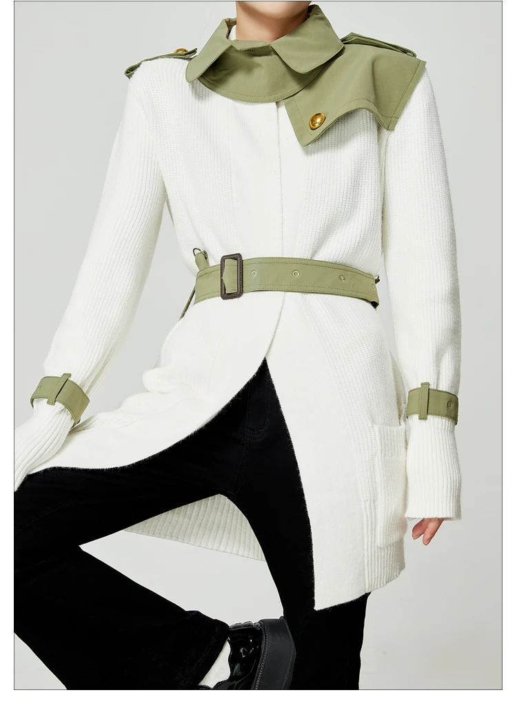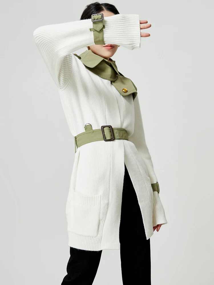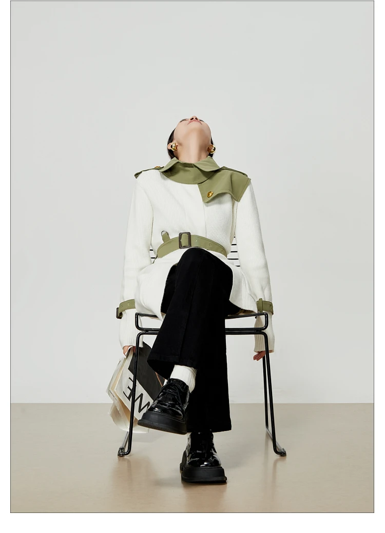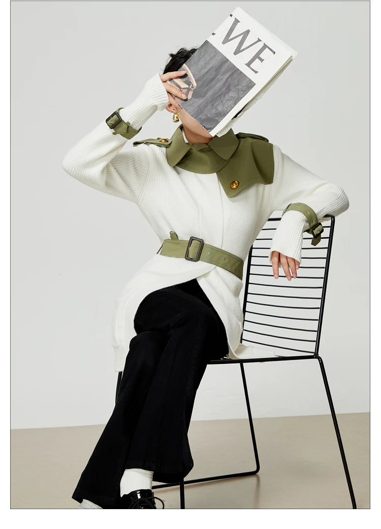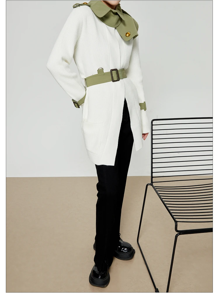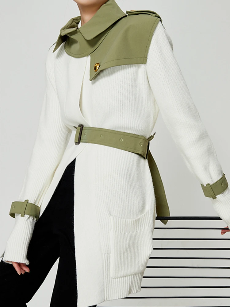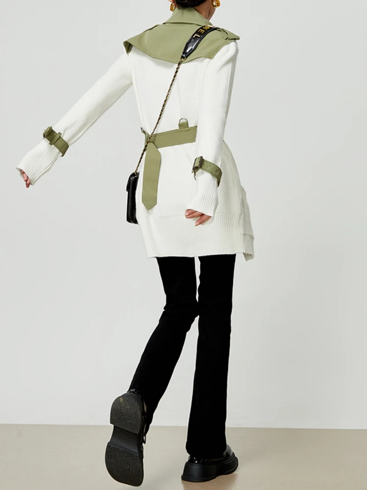Spliced Sweater For Women Fashion Lapel Full Sleeve Belt Niche Design Contrast Color Knit Tops Autumn