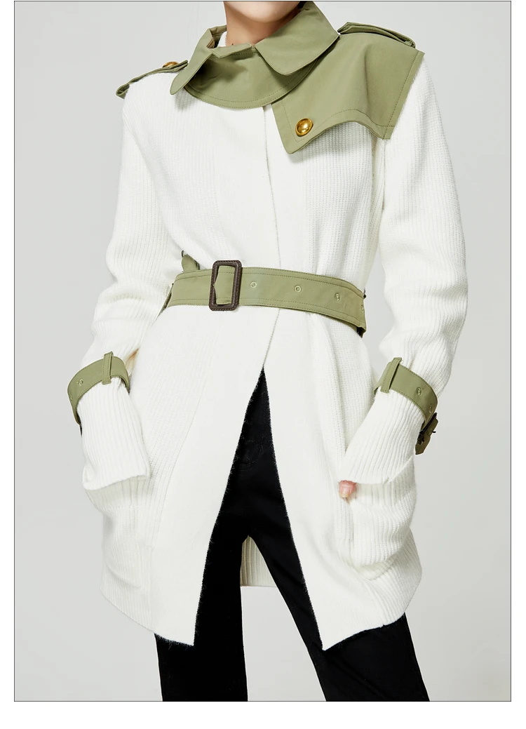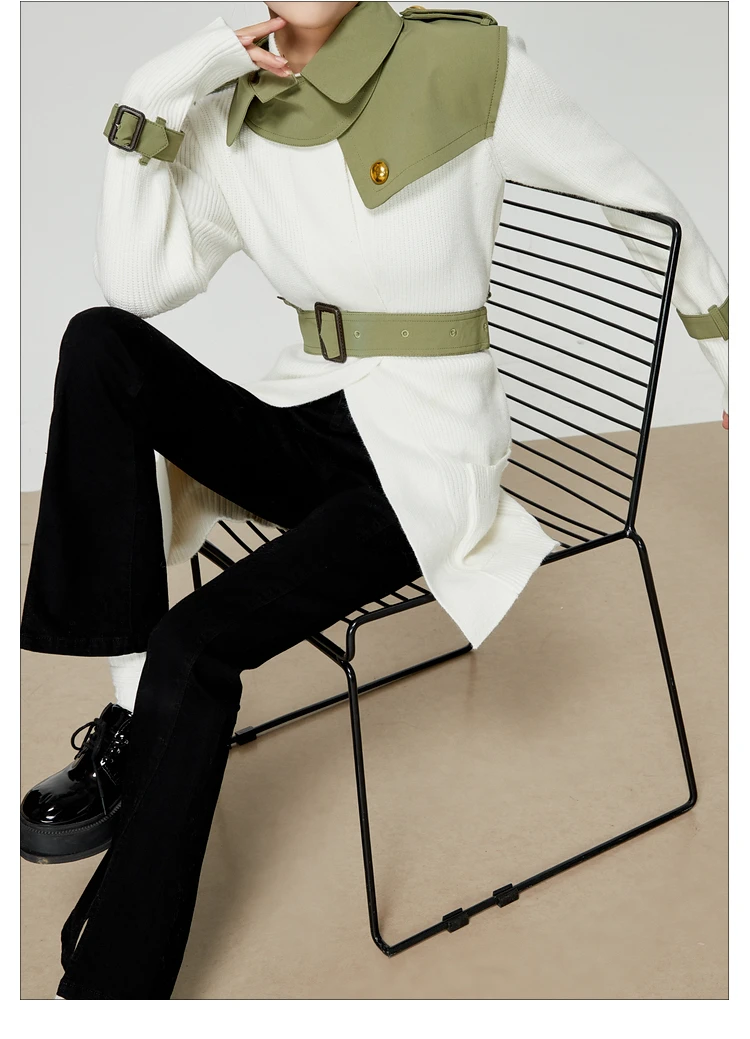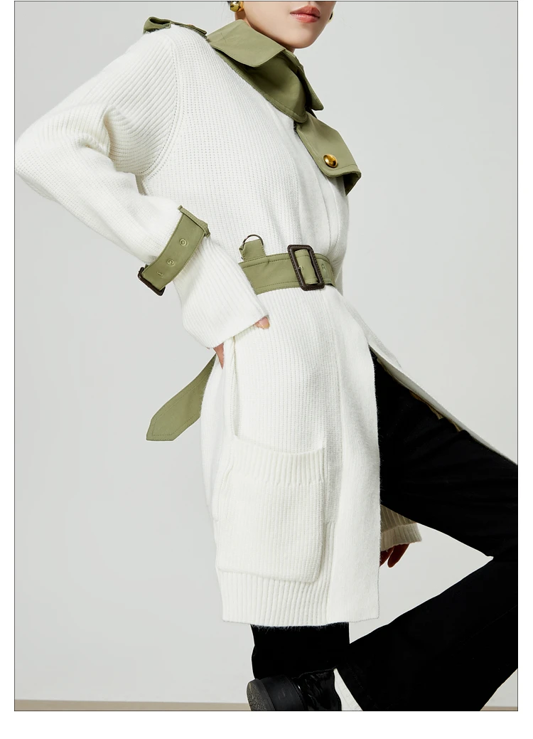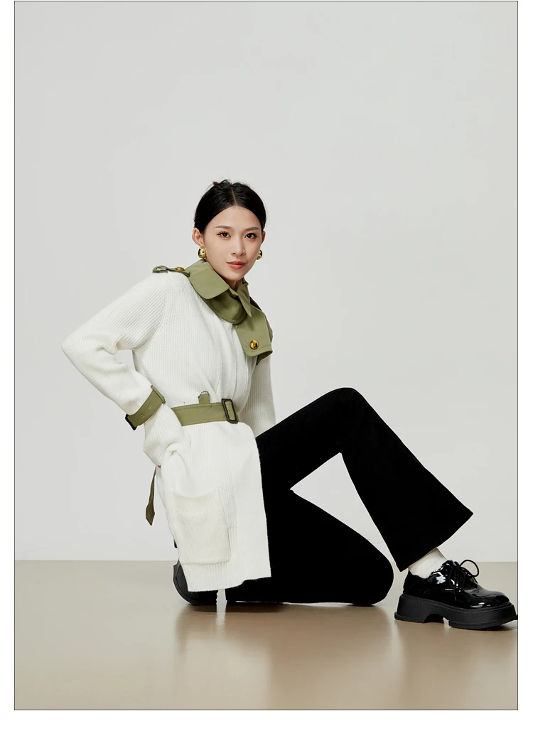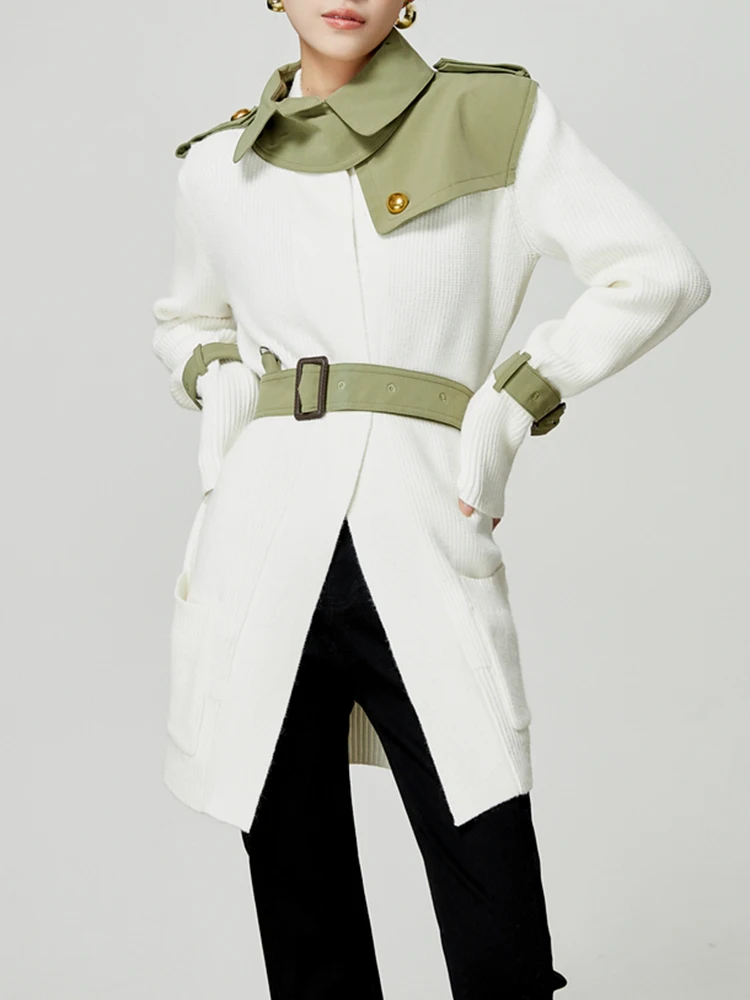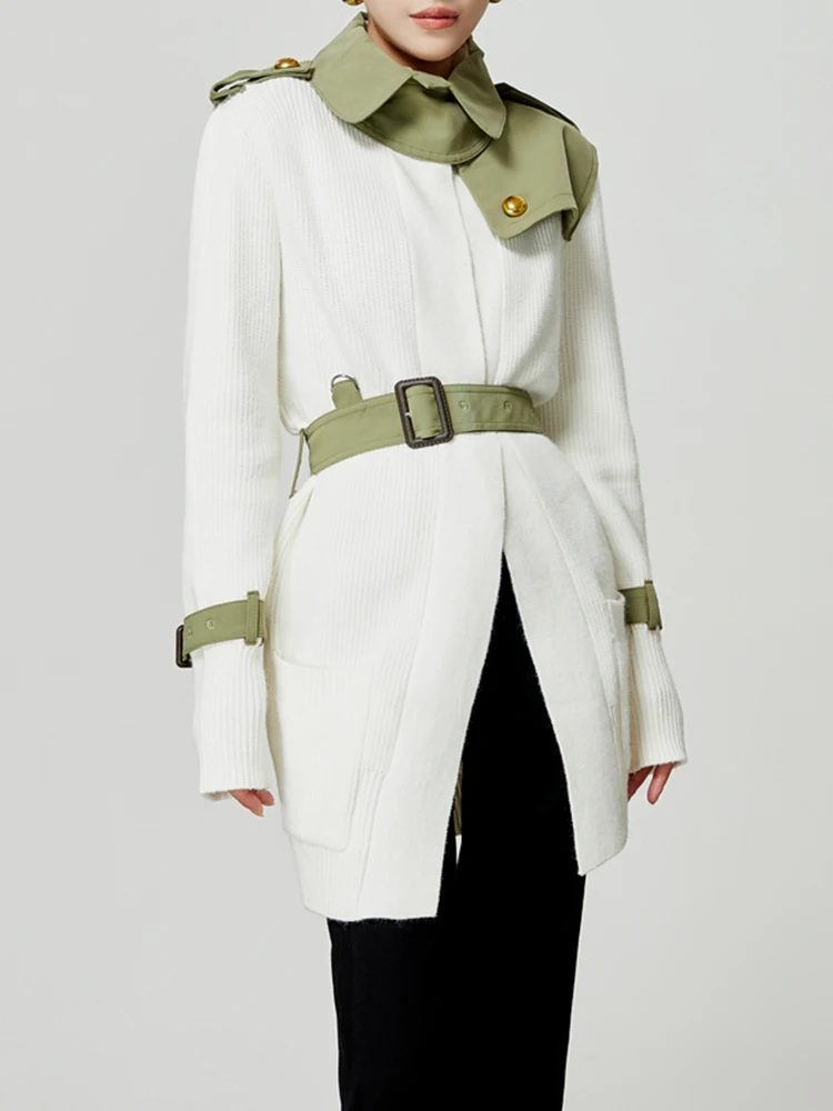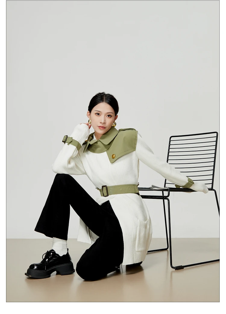 Spliced Sweater For Women Fashion Lapel Full Sleeve Belt Niche Design Contrast Color Knit Tops Autumn