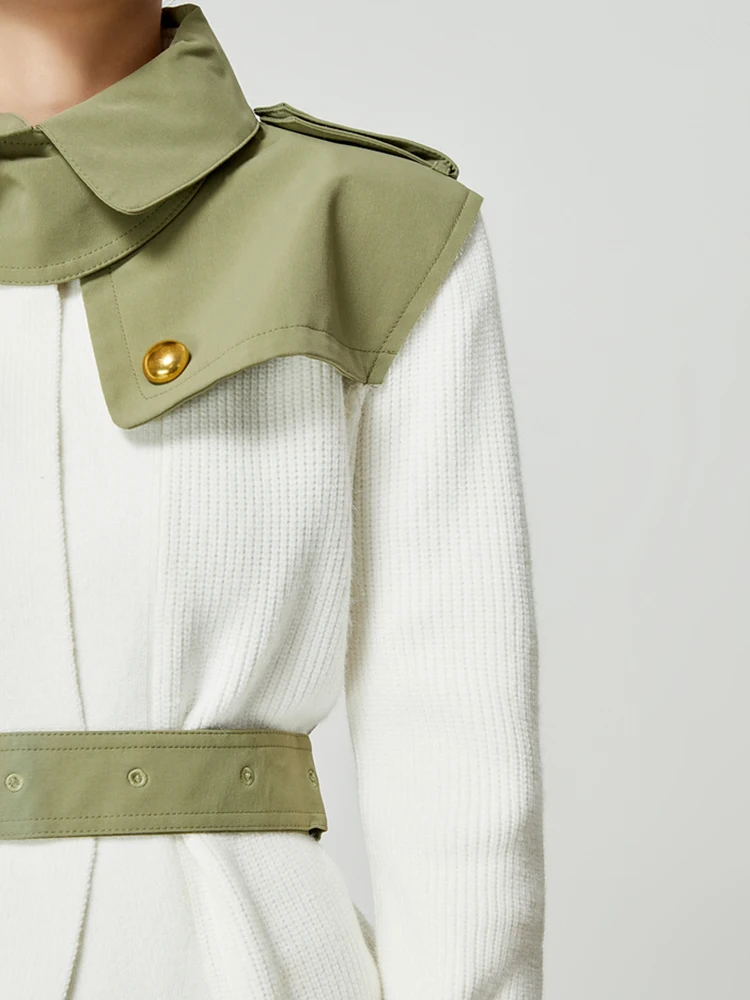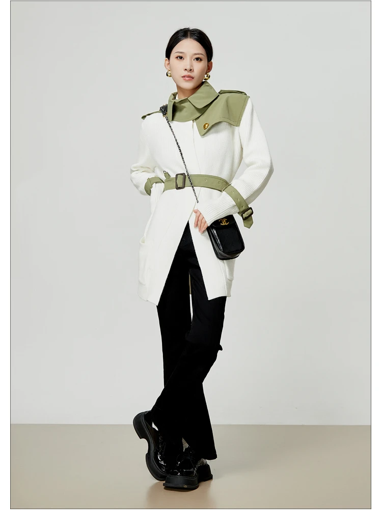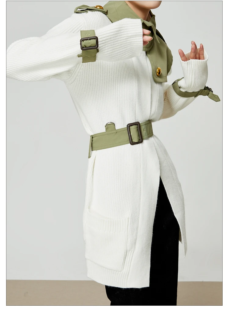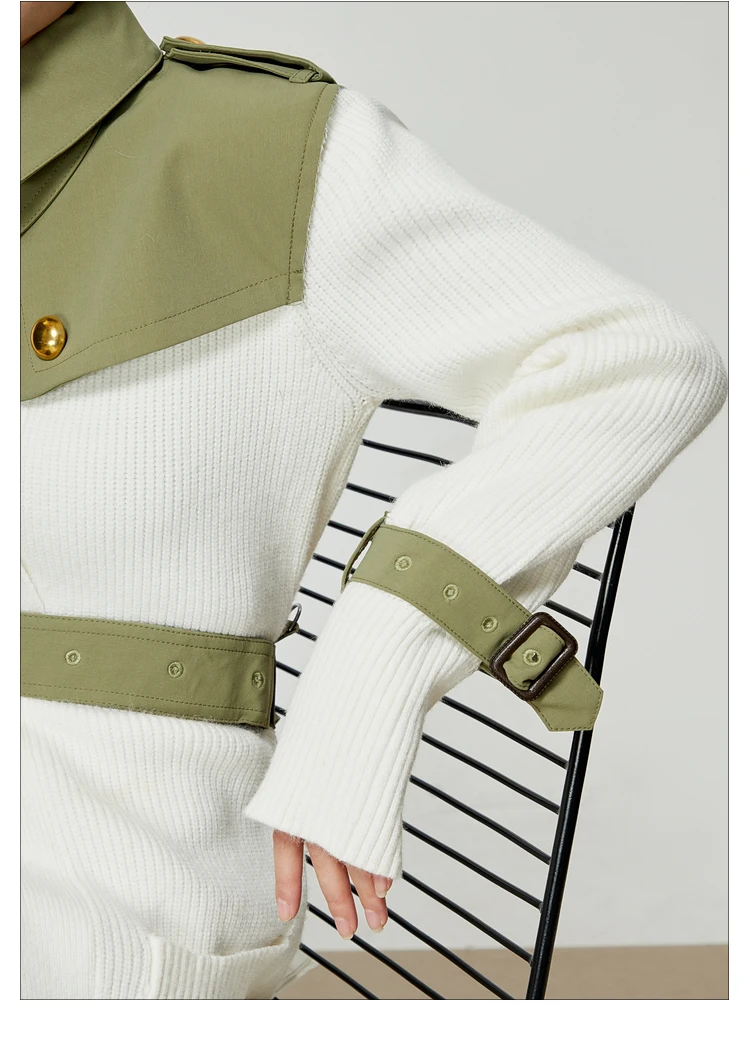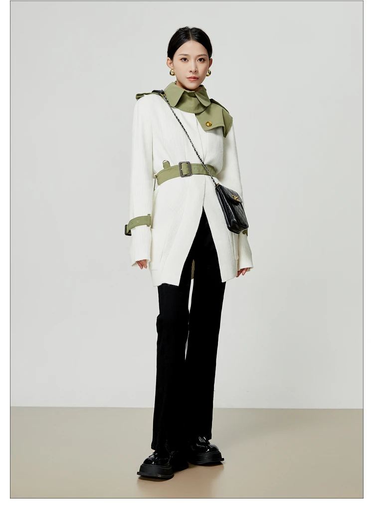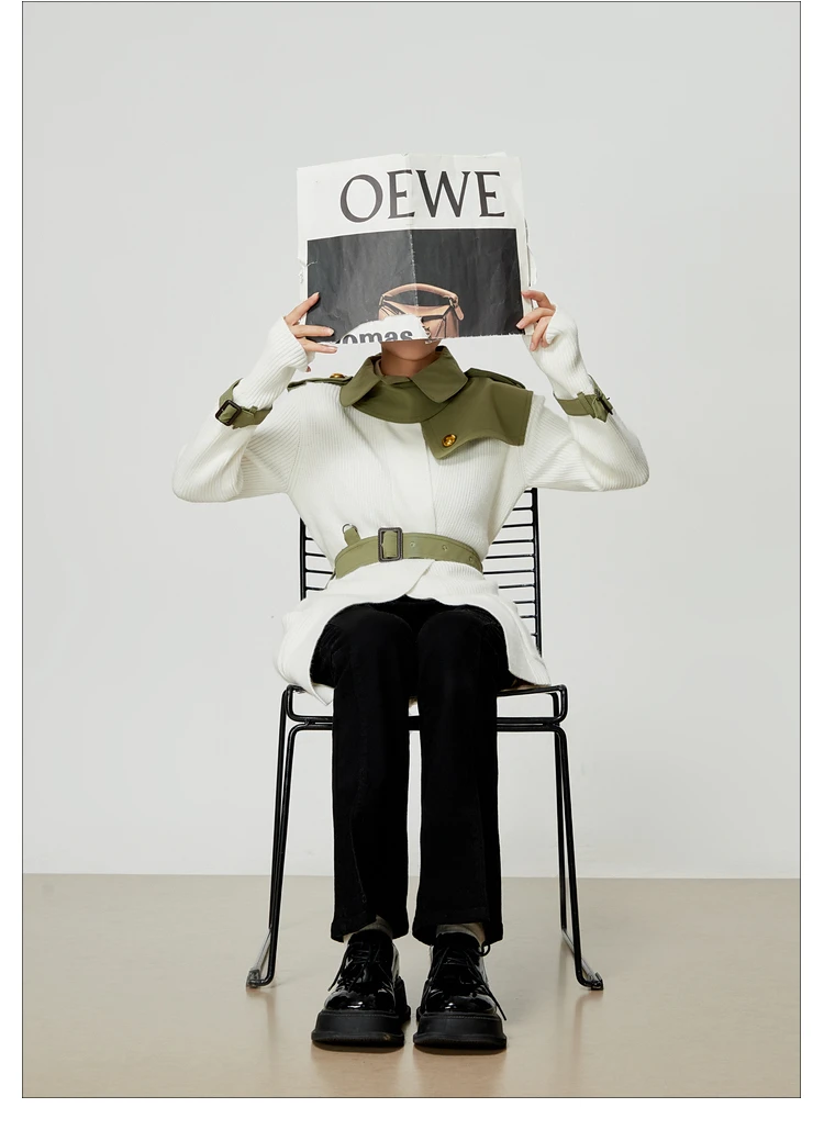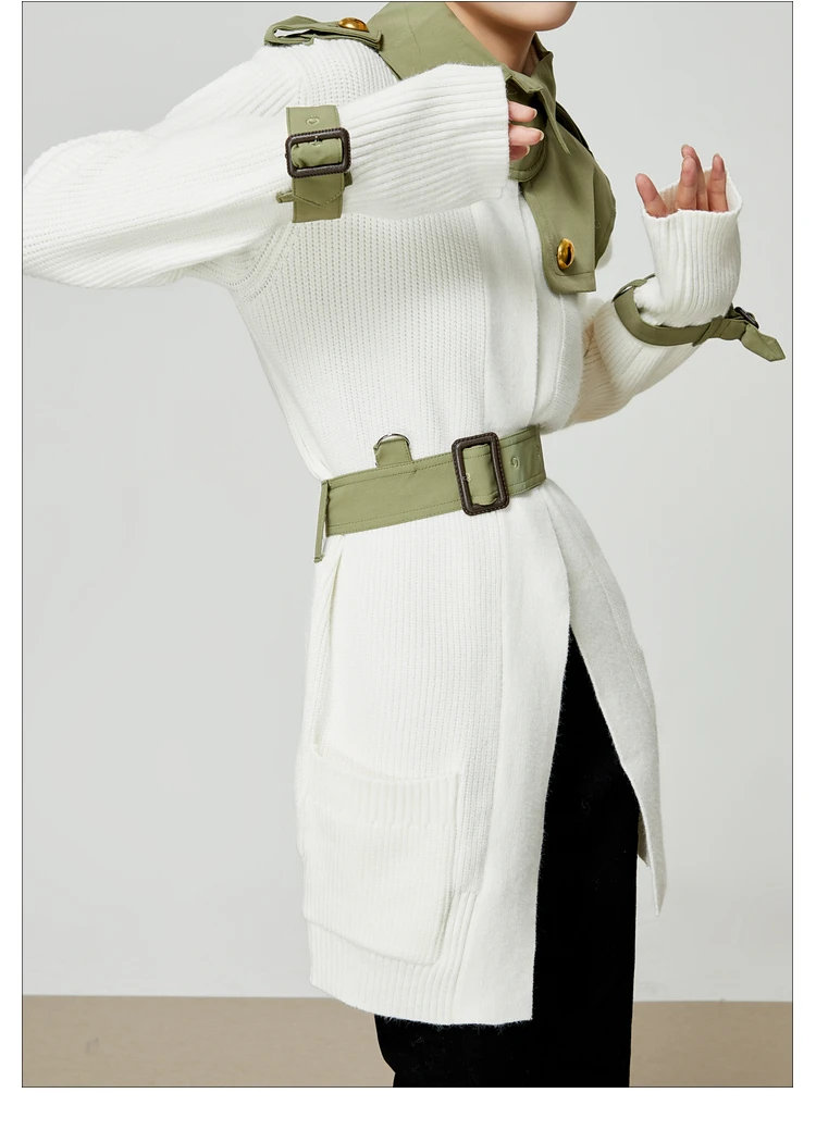 Spliced Sweater For Women Fashion Lapel Full Sleeve Belt Niche Design Contrast Color Knit Tops Autumn