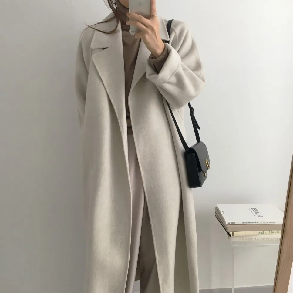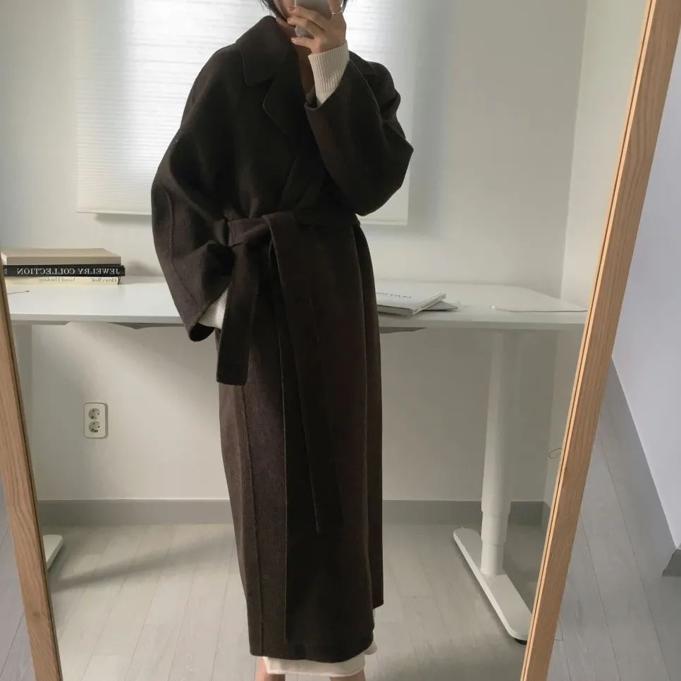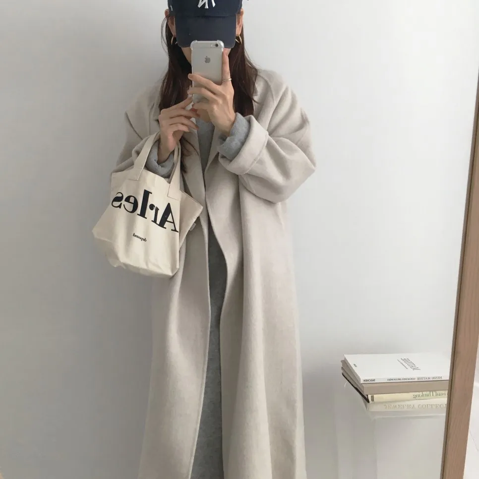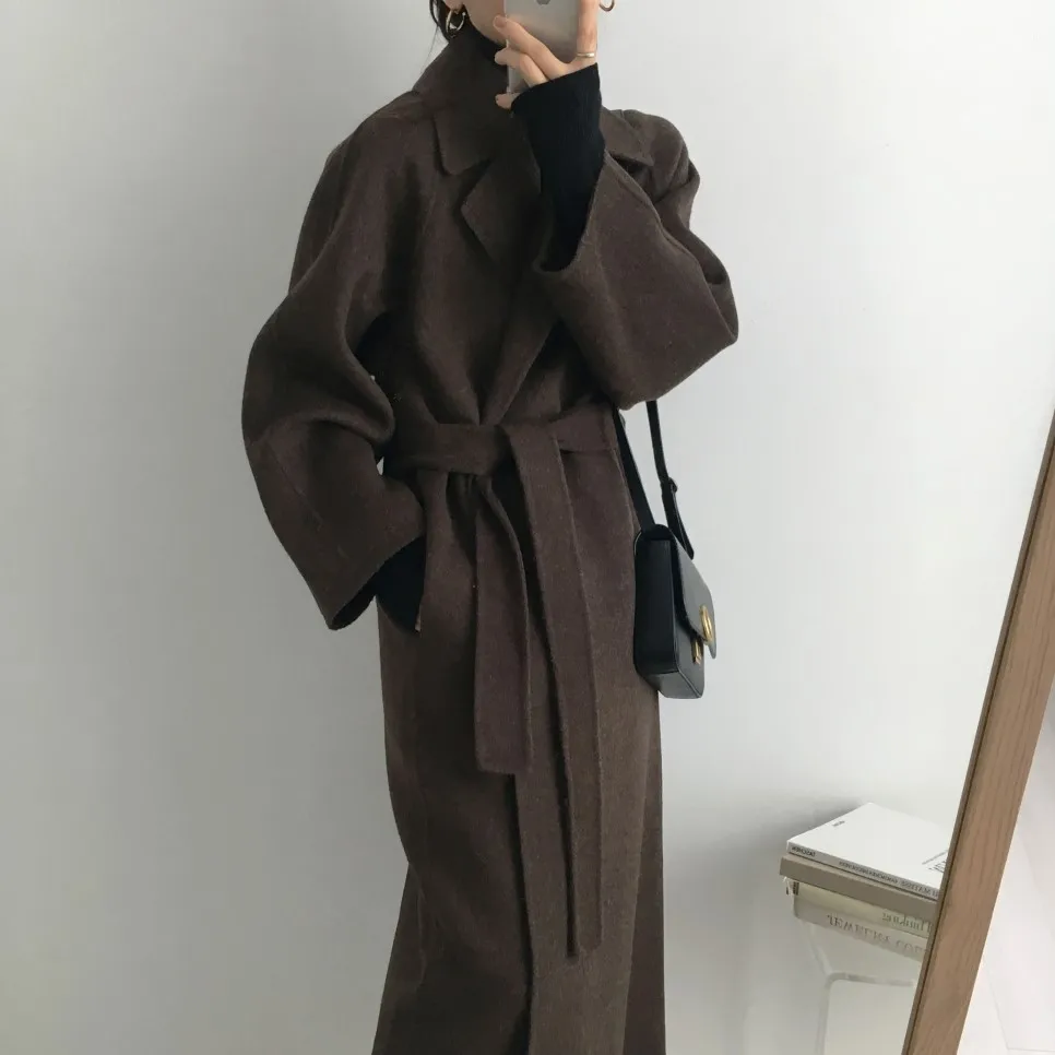 Women Autumn Winter Elegant Woolen Coat Casual Loose Solid Vintage Overcoat with Belted Female Fashion Warm Outerwear Clothes