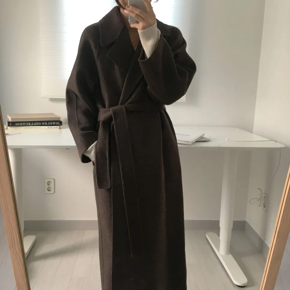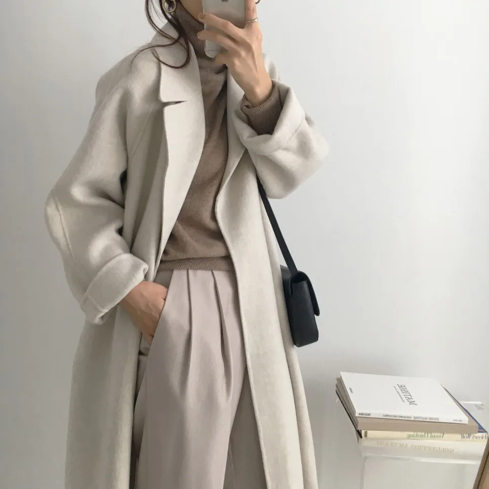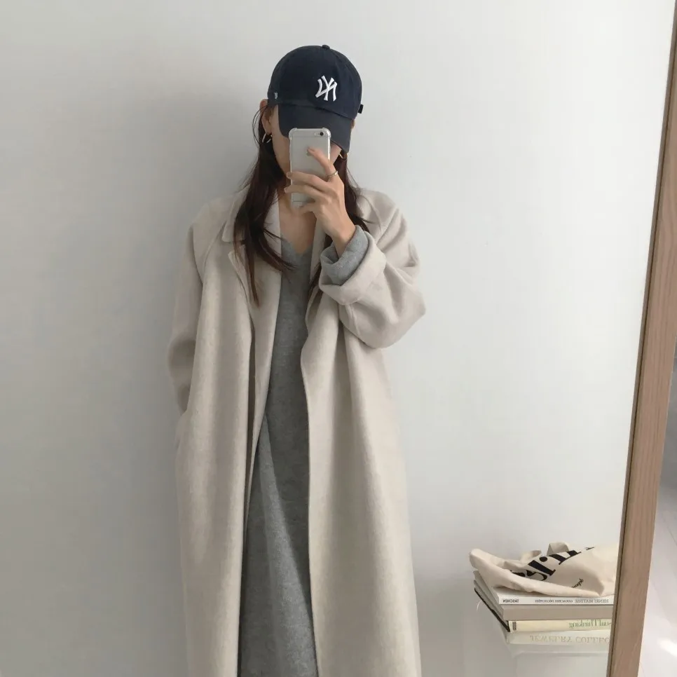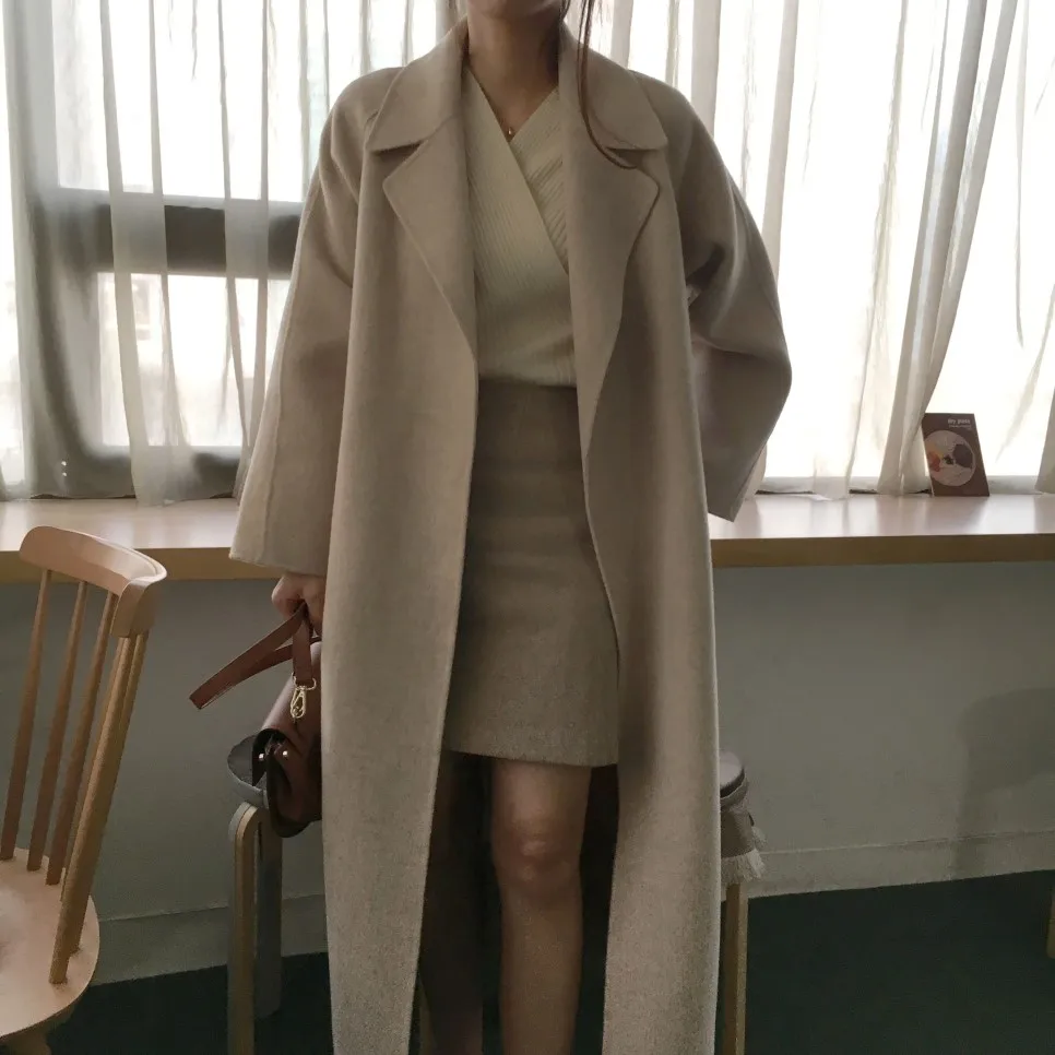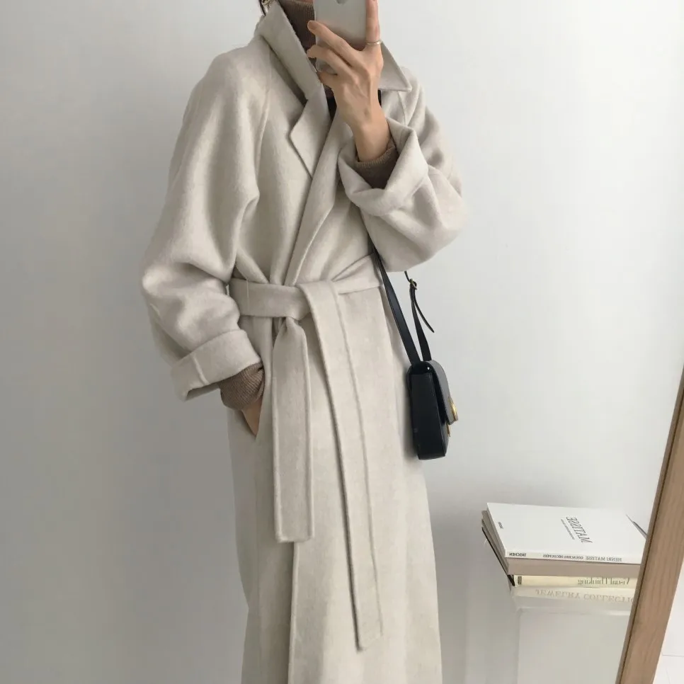 Women Autumn Winter Elegant Woolen Coat Casual Loose Solid Vintage Overcoat with Belted Female Fashion Warm Outerwear Clothes