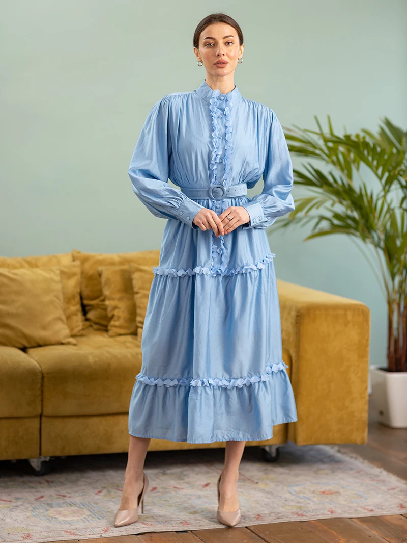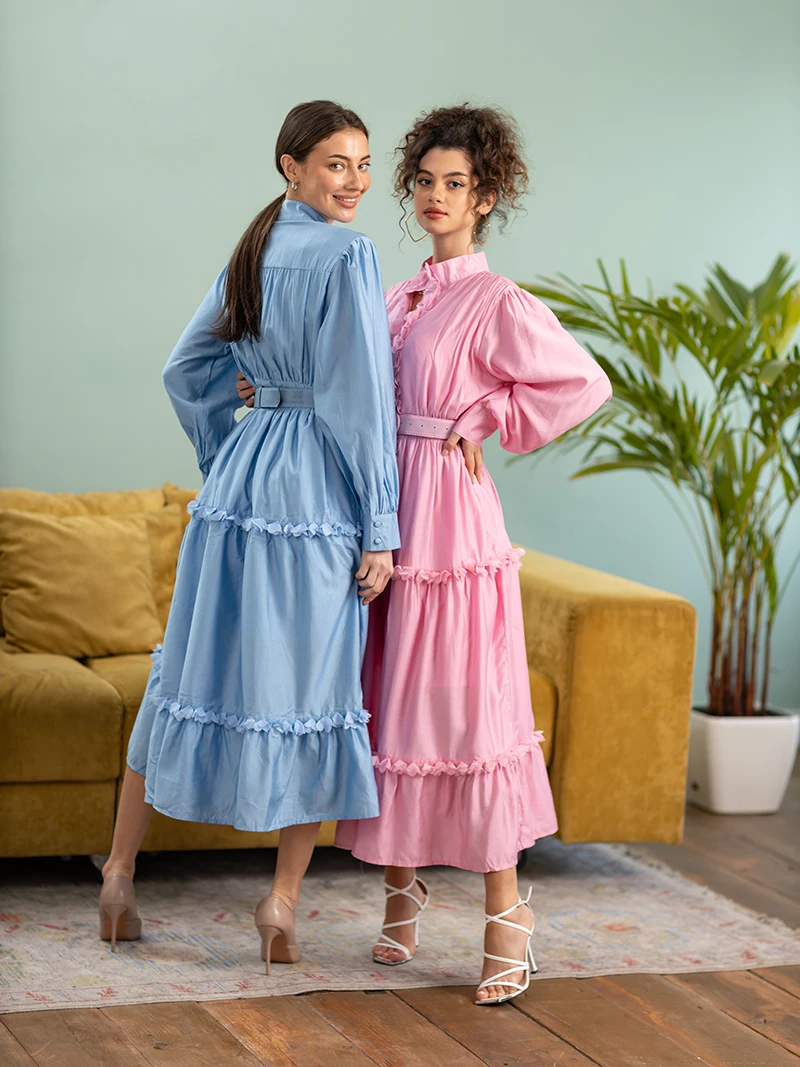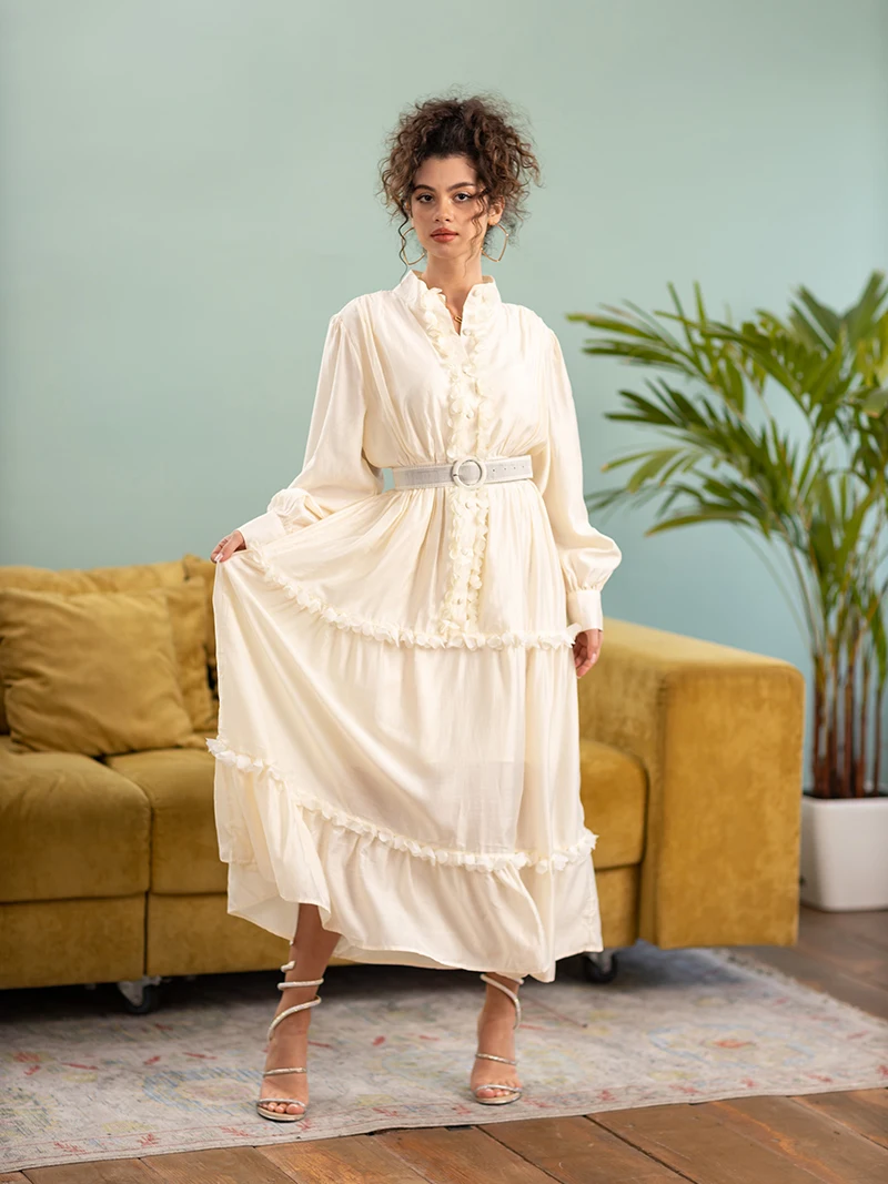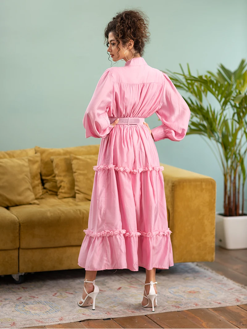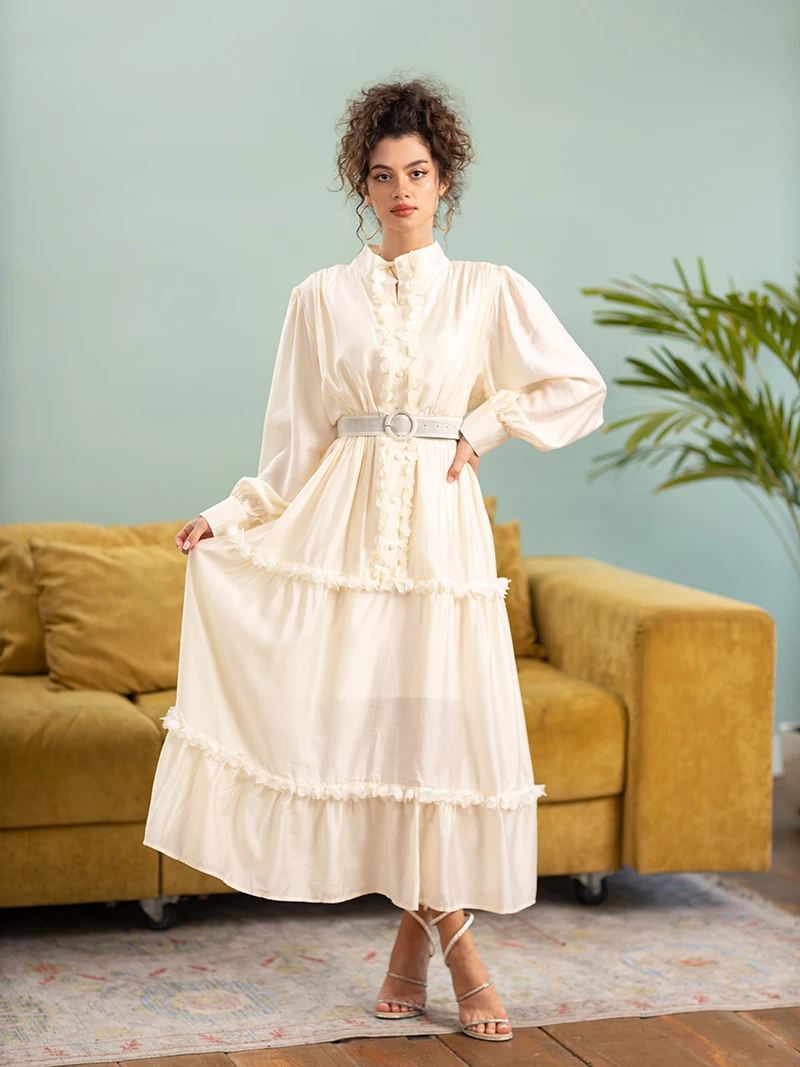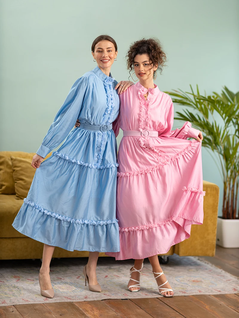 Elegant Ladies Women Long Pleated Evening Dress White Pink Blue Green Chiffon Long Sleeve Summer Dress with Belt For Women