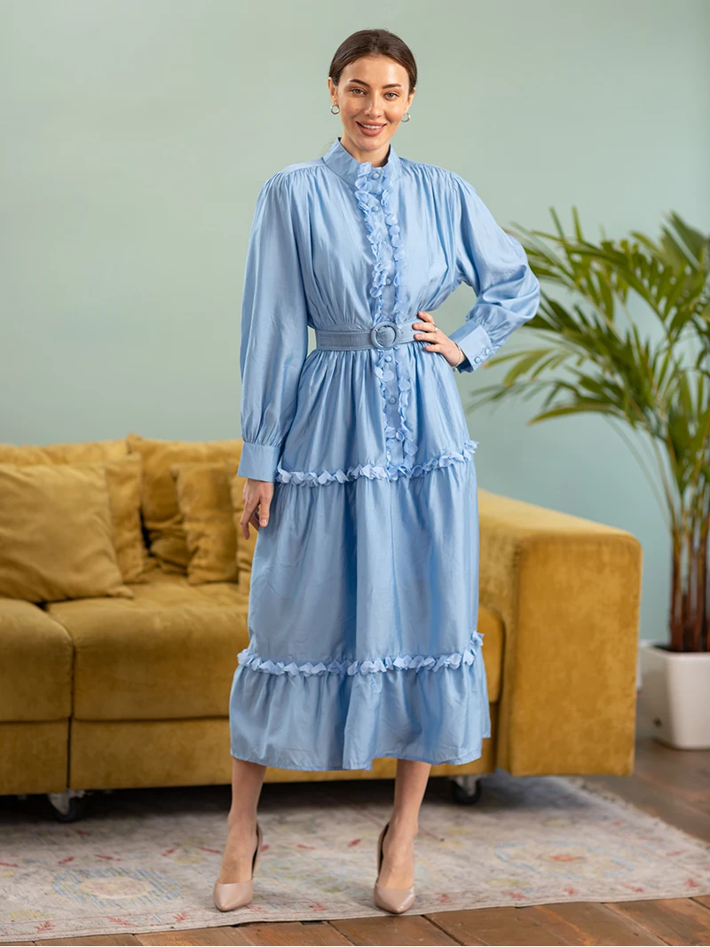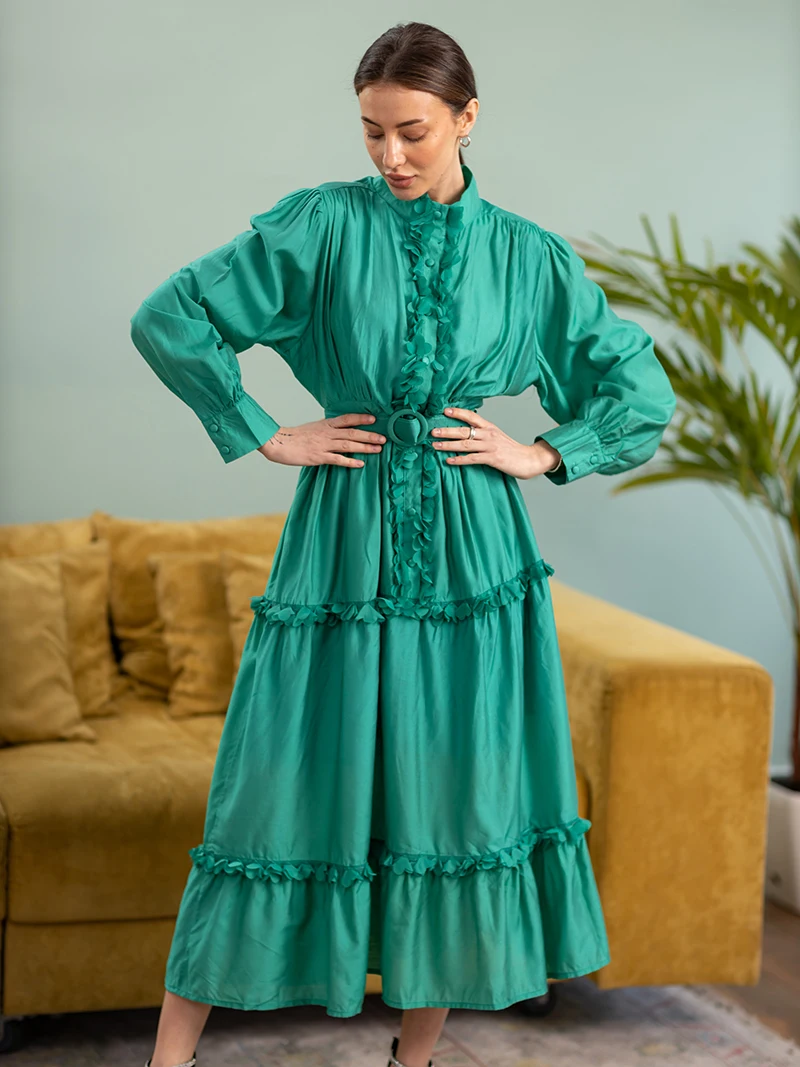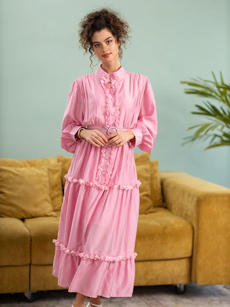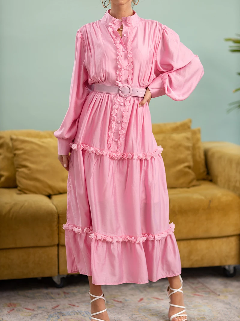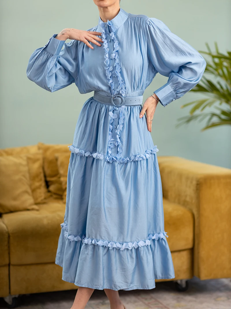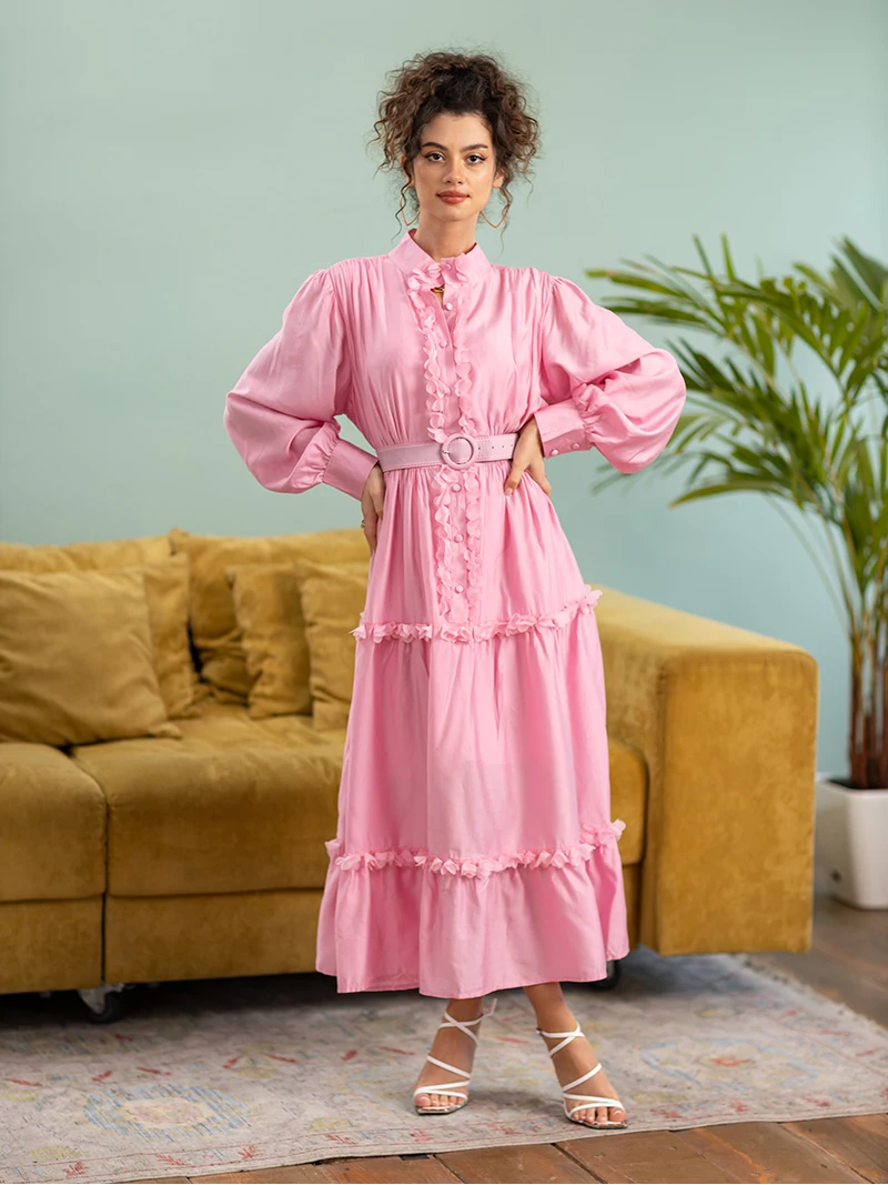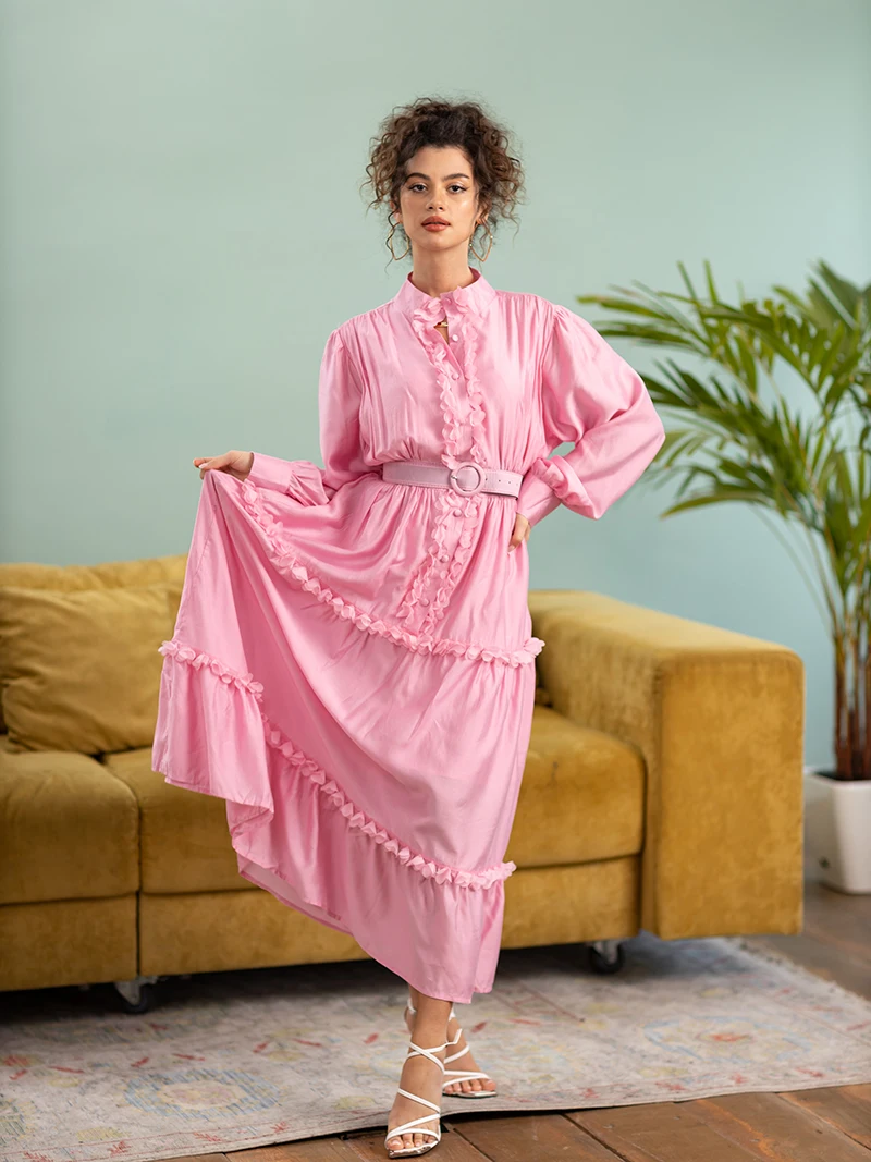 Elegant Ladies Women Long Pleated Evening Dress White Pink Blue Green Chiffon Long Sleeve Summer Dress with Belt For Women