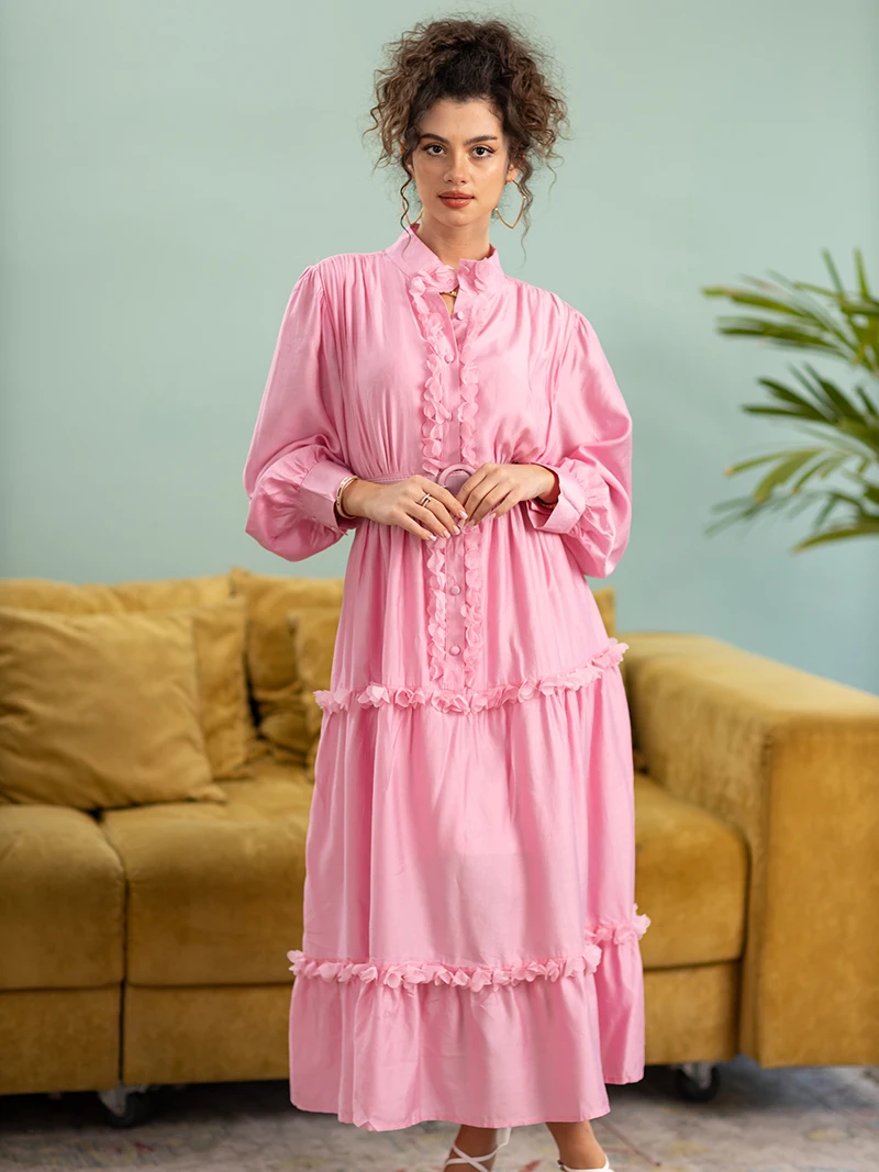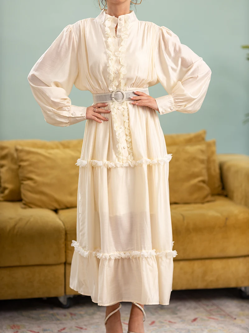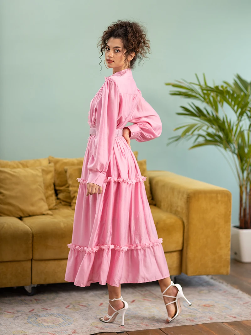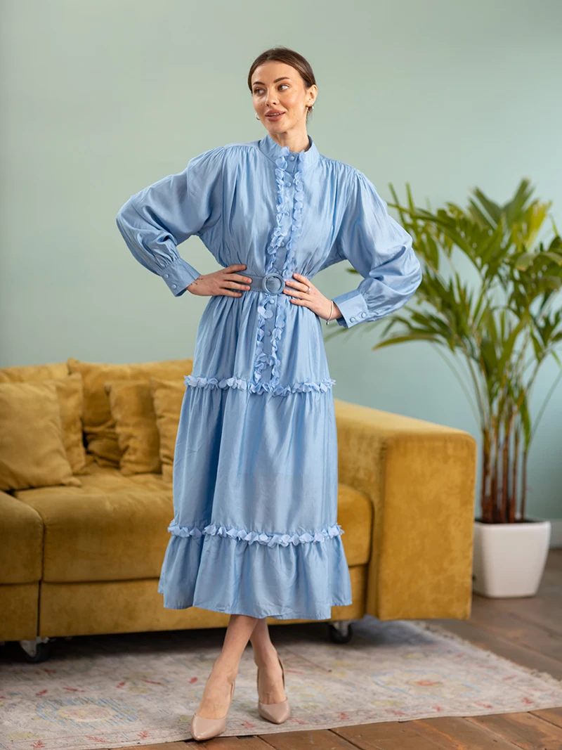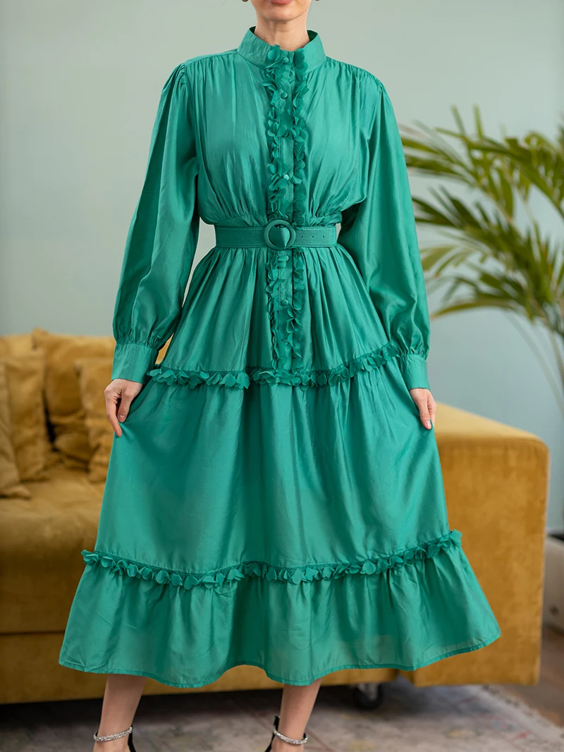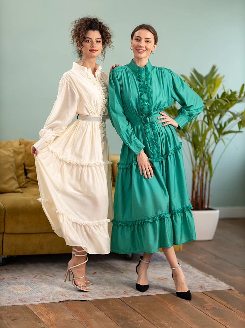 Elegant Ladies Women Long Pleated Evening Dress White Pink Blue Green Chiffon Long Sleeve Summer Dress with Belt For Women