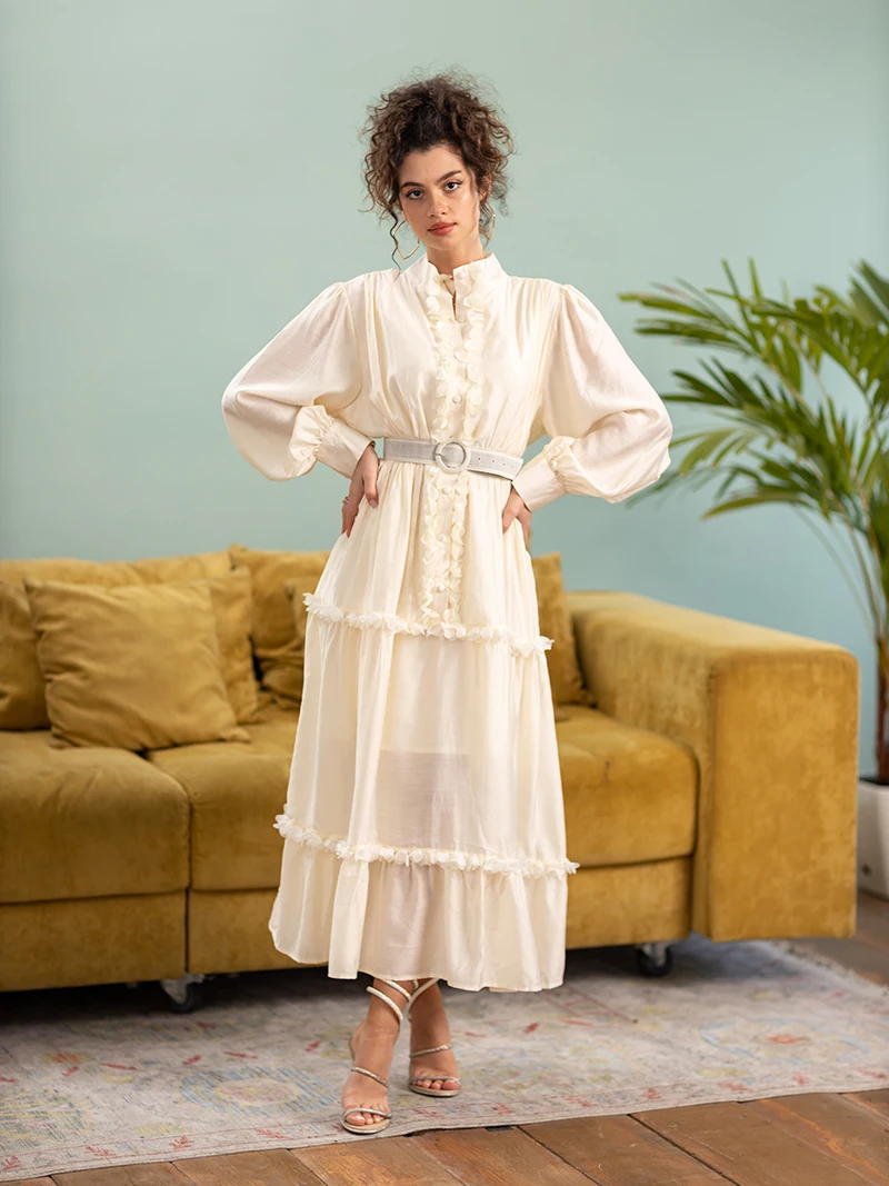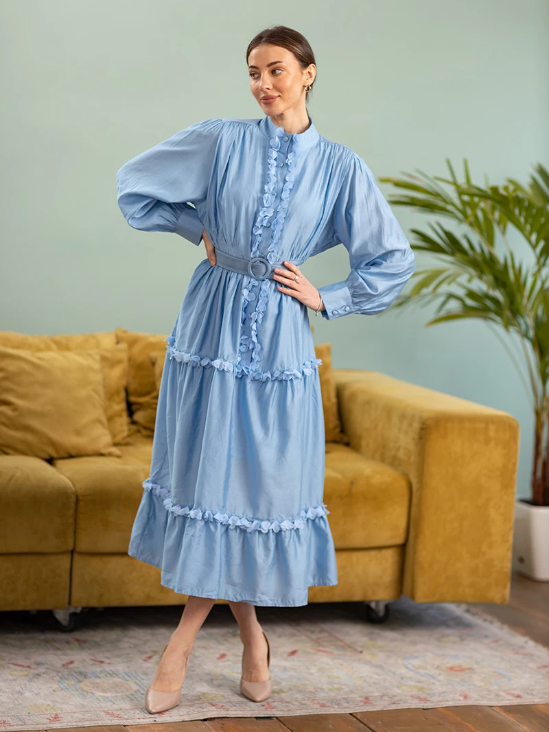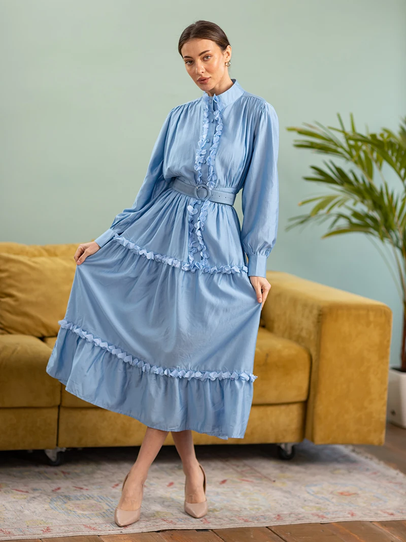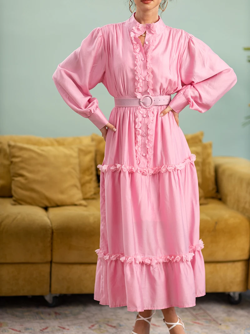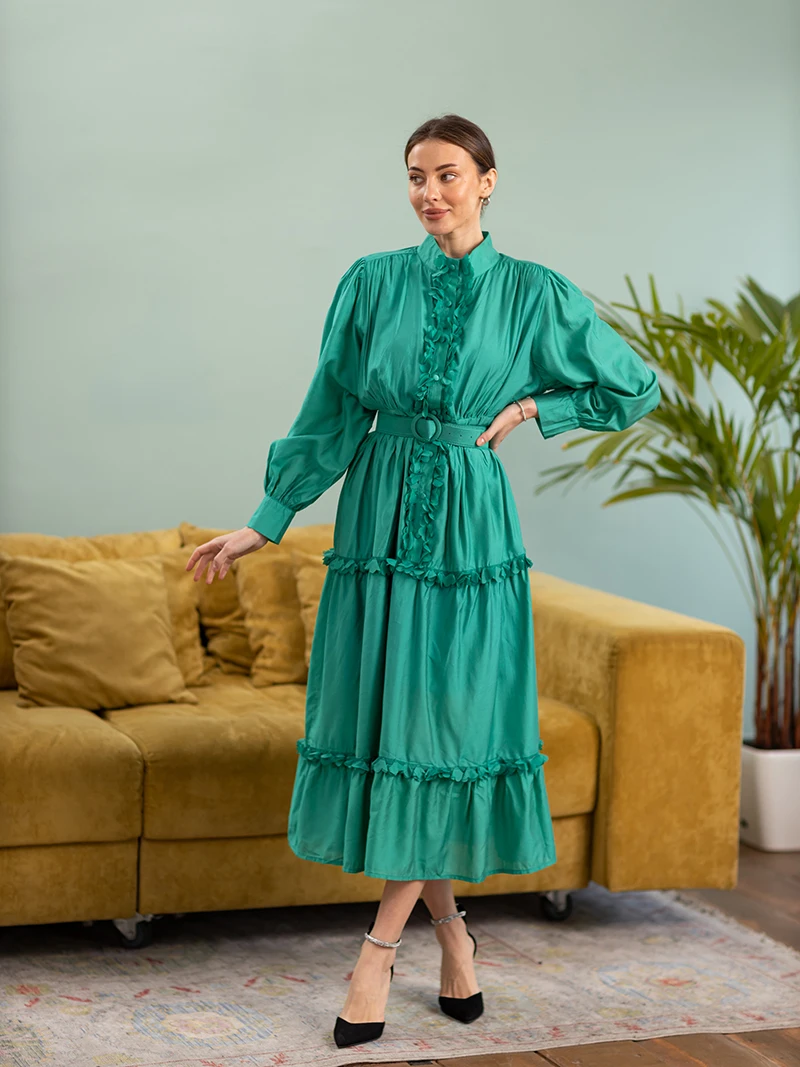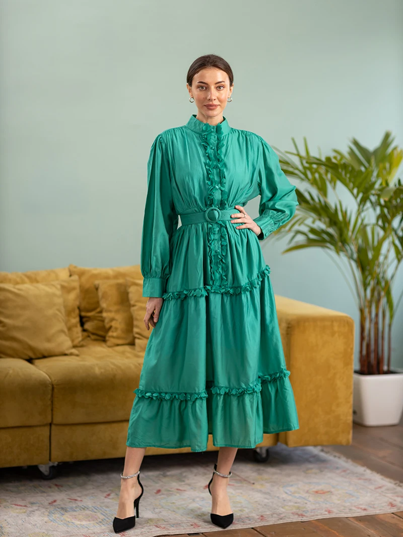 Elegant Ladies Women Long Pleated Evening Dress White Pink Blue Green Chiffon Long Sleeve Summer Dress with Belt For Women
