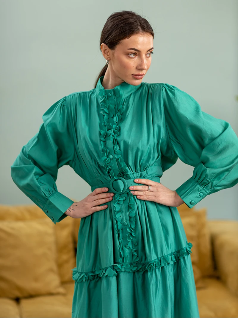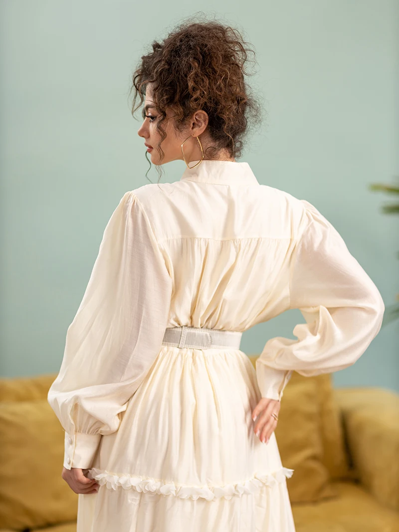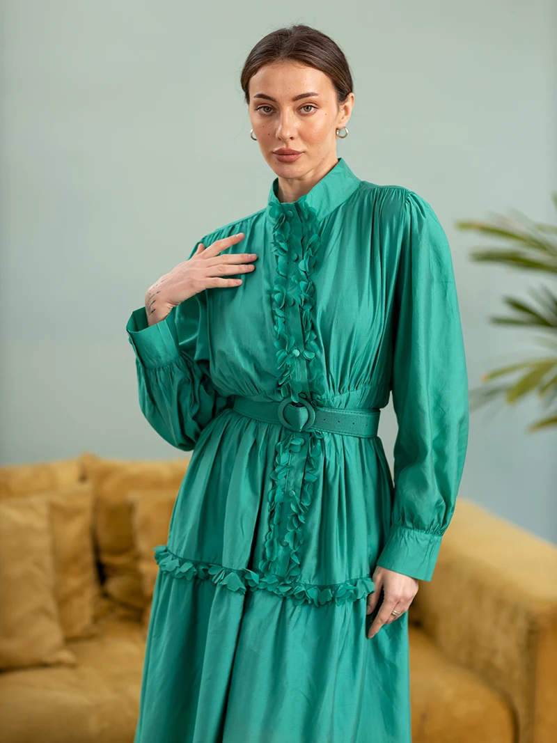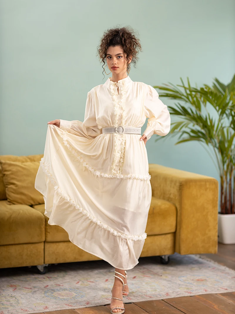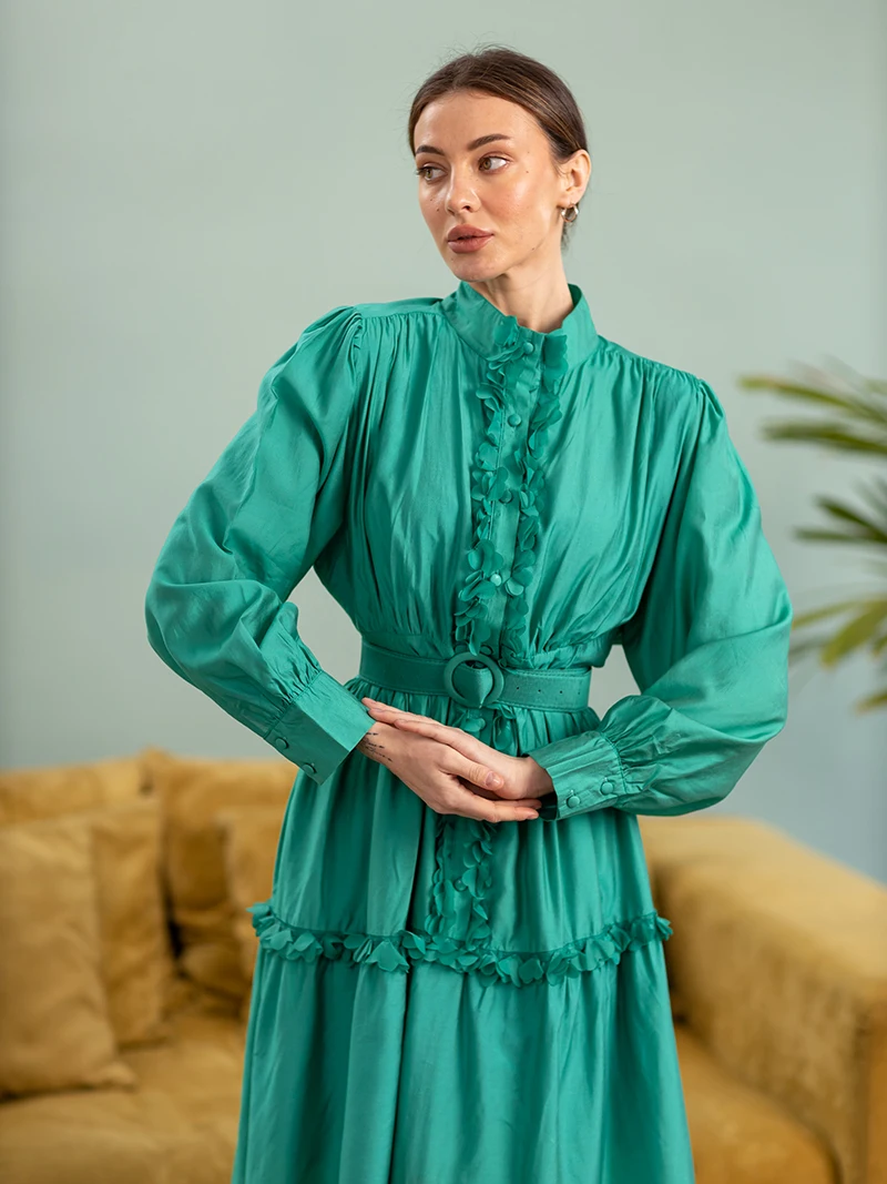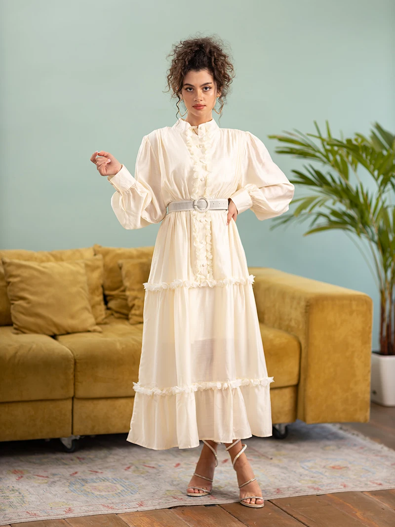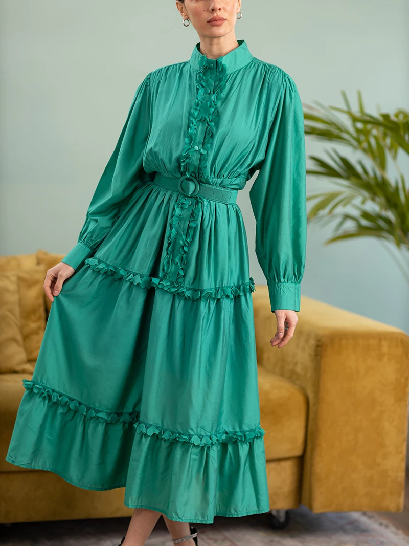 Elegant Ladies Women Long Pleated Evening Dress White Pink Blue Green Chiffon Long Sleeve Summer Dress with Belt For Women