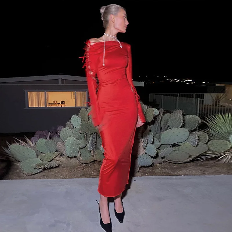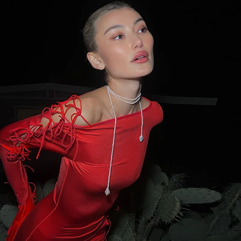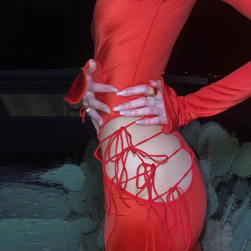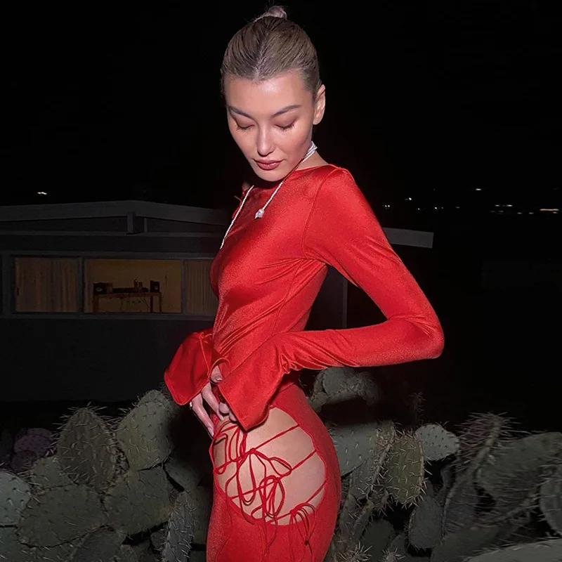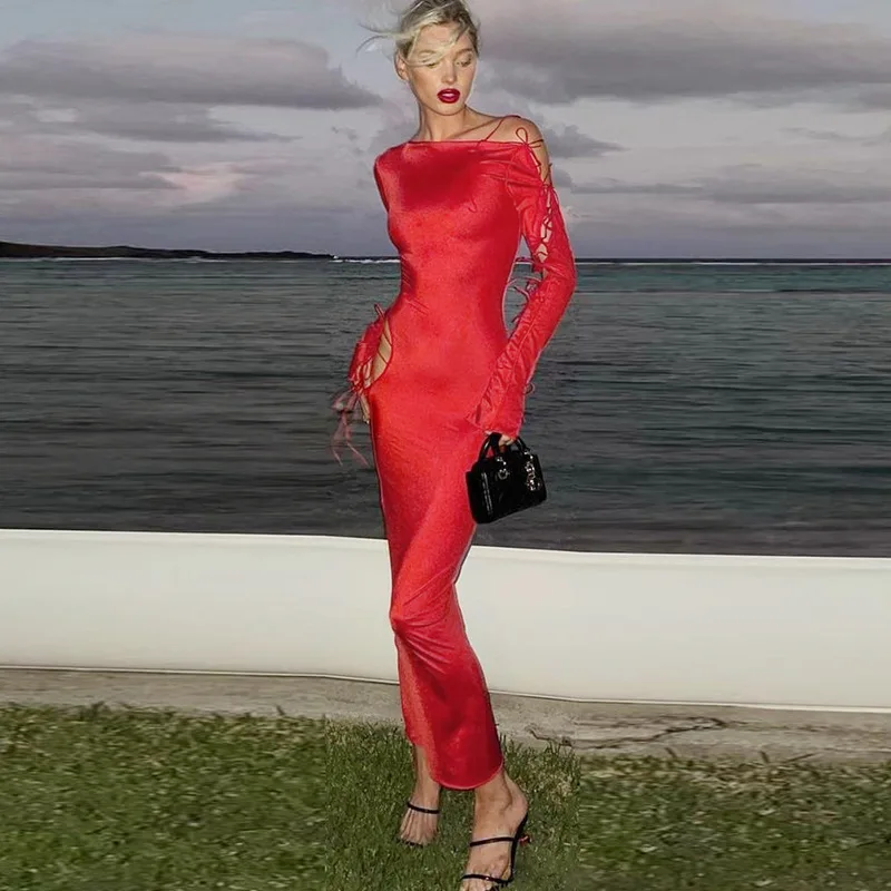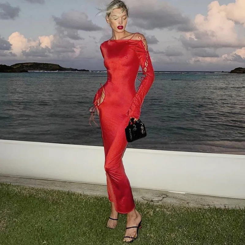 Hot Sexy Side Bandage Lace Up Red Long Sleeve Maxi Dress Elegant Outfits for Women Club Party Long Dresses Vestido