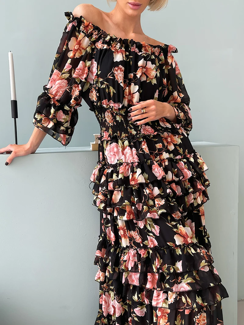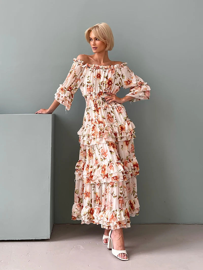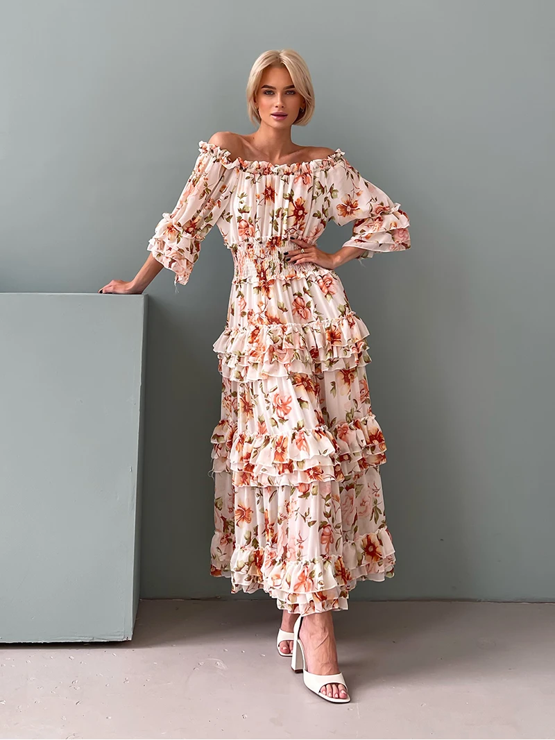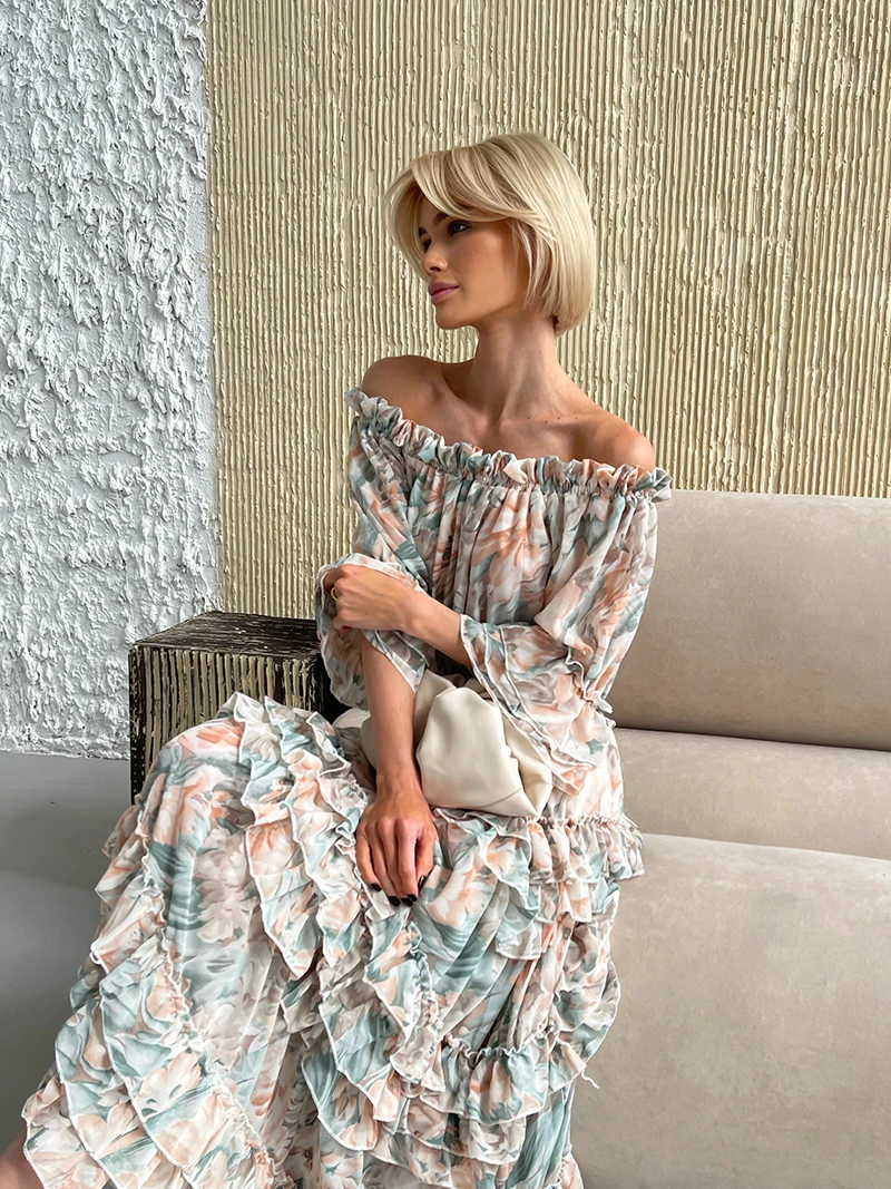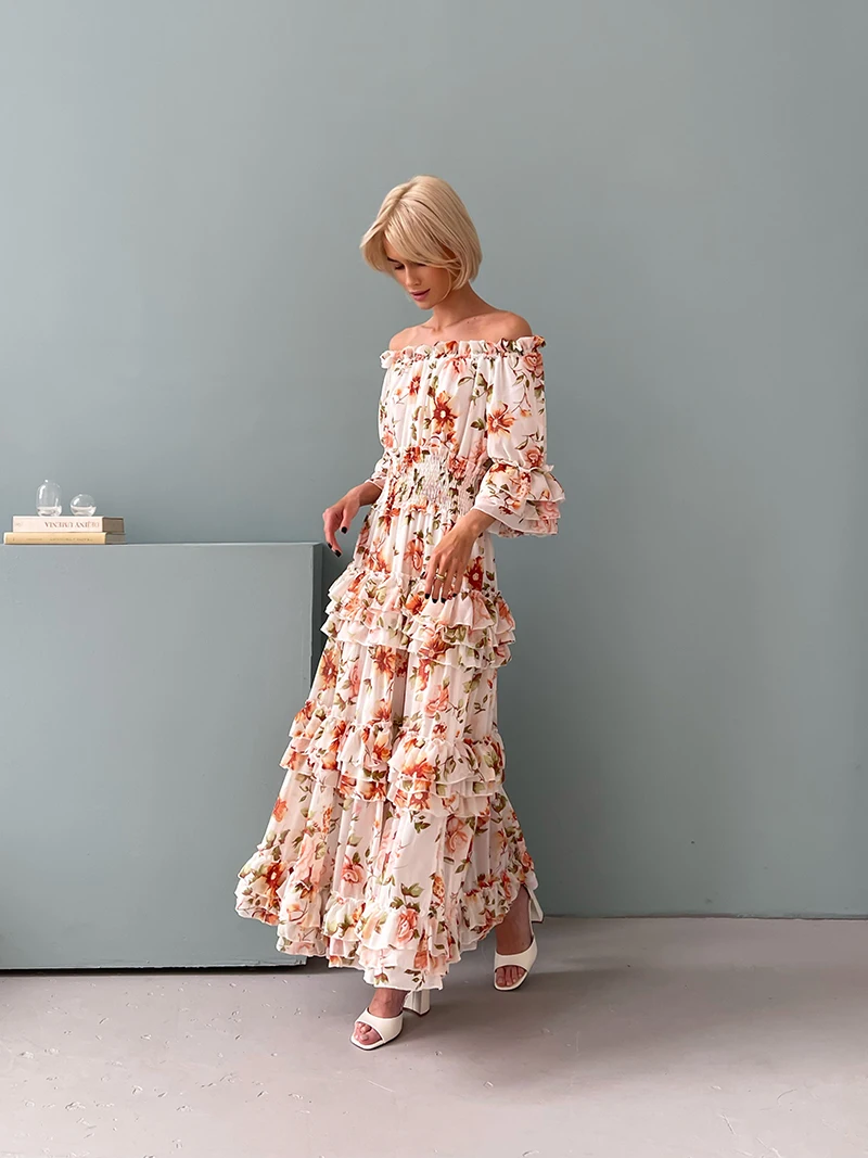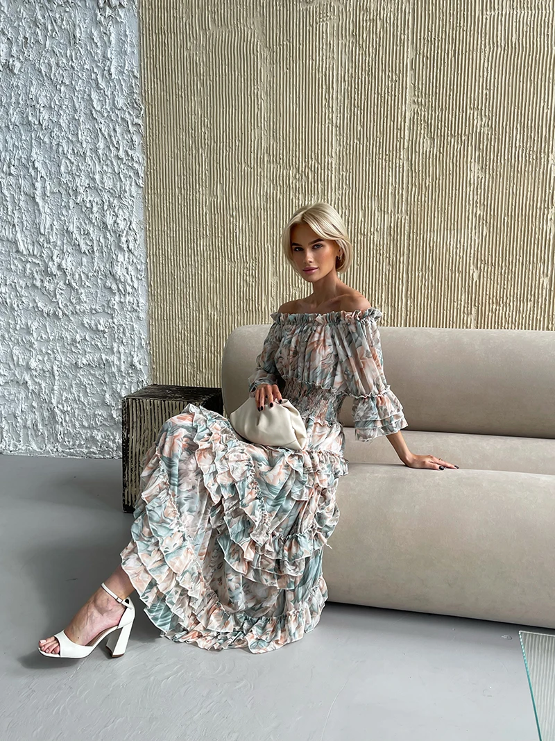 Chiffon Floral Ruffle Pleated Women Long Dresses Elegant Ladies Summer Beach Dress Long Sleeve Flower Maxi Dresses For Women