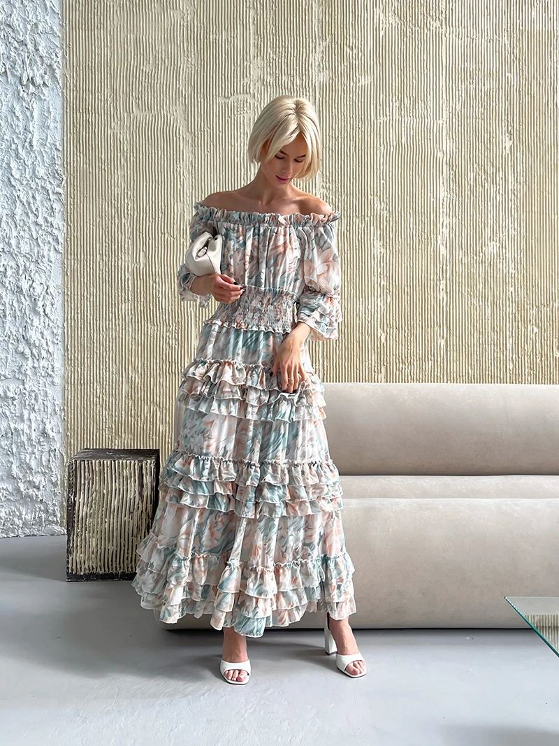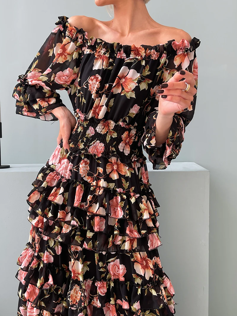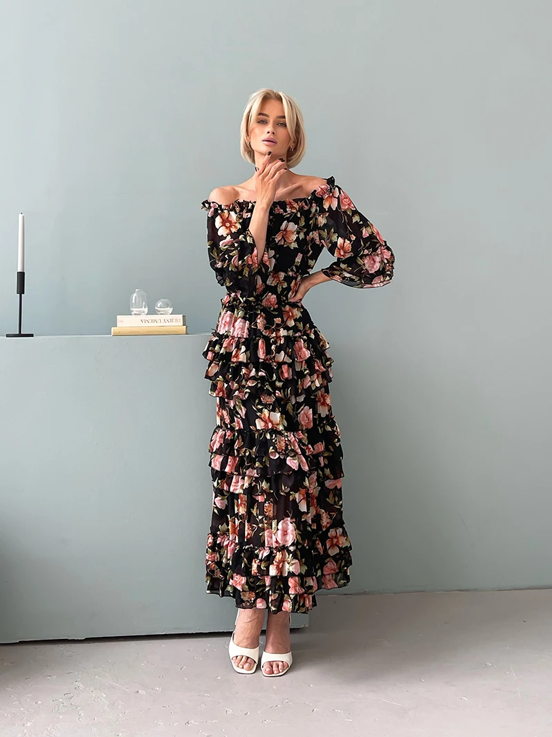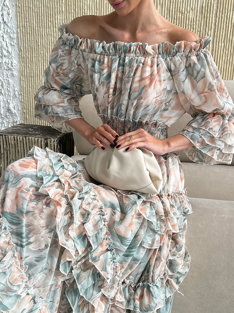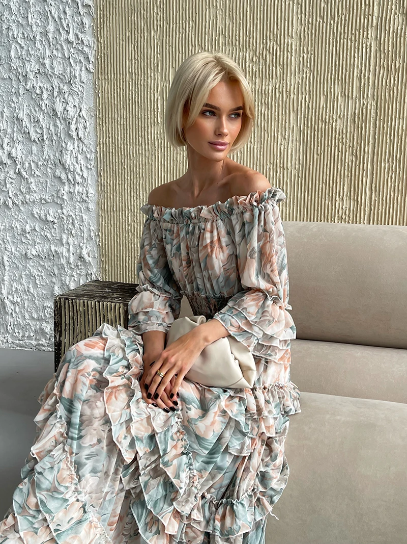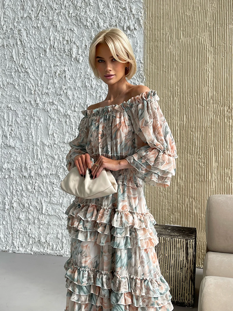 Chiffon Floral Ruffle Pleated Women Long Dresses Elegant Ladies Summer Beach Dress Long Sleeve Flower Maxi Dresses For Women