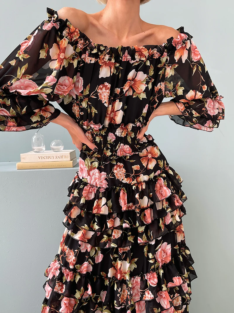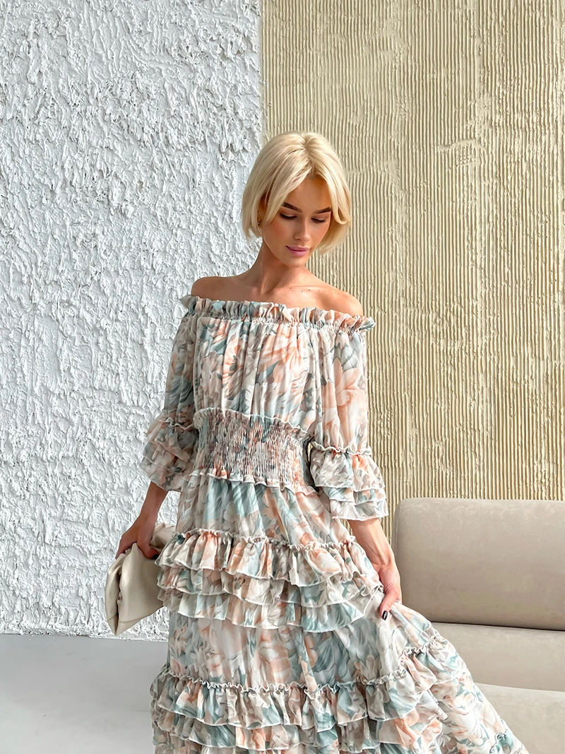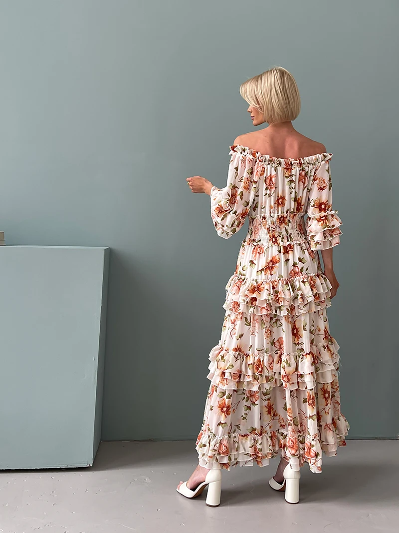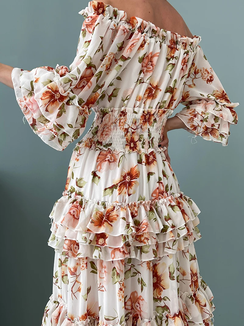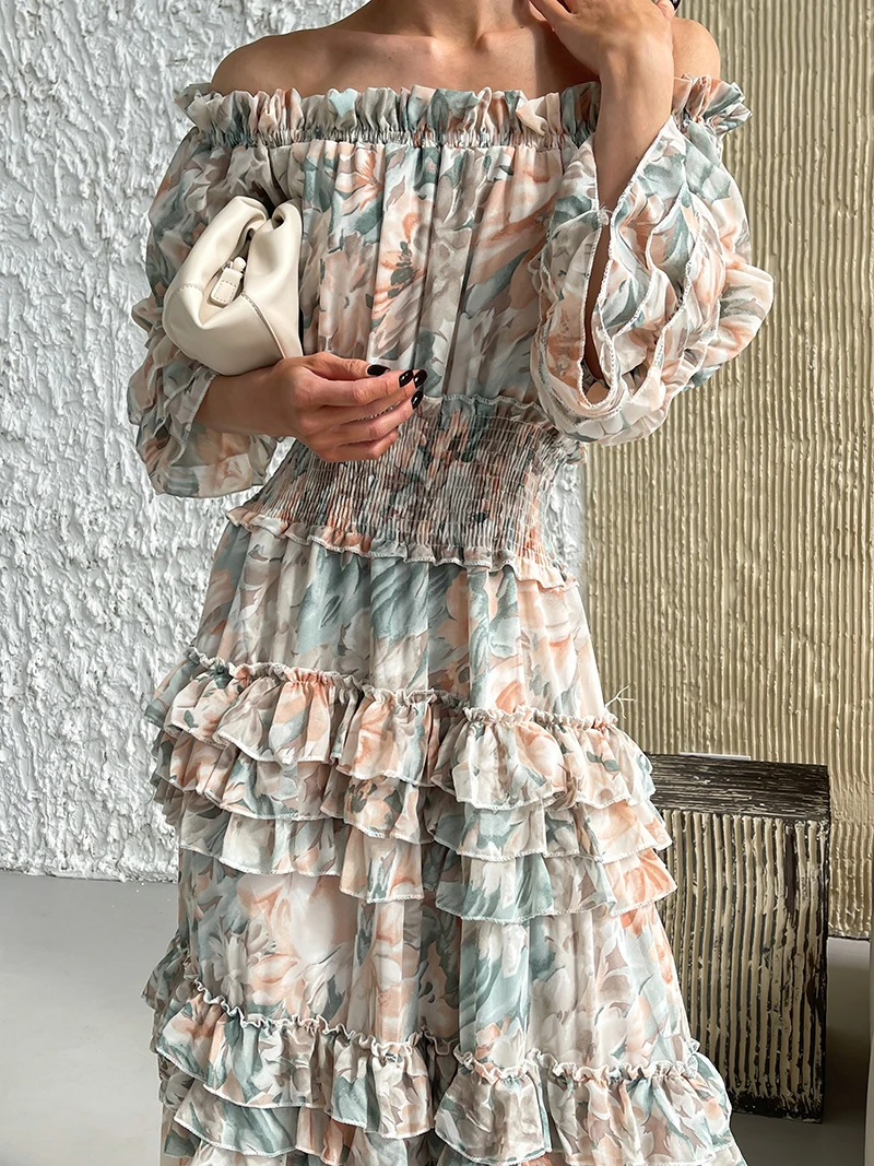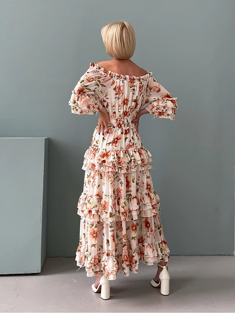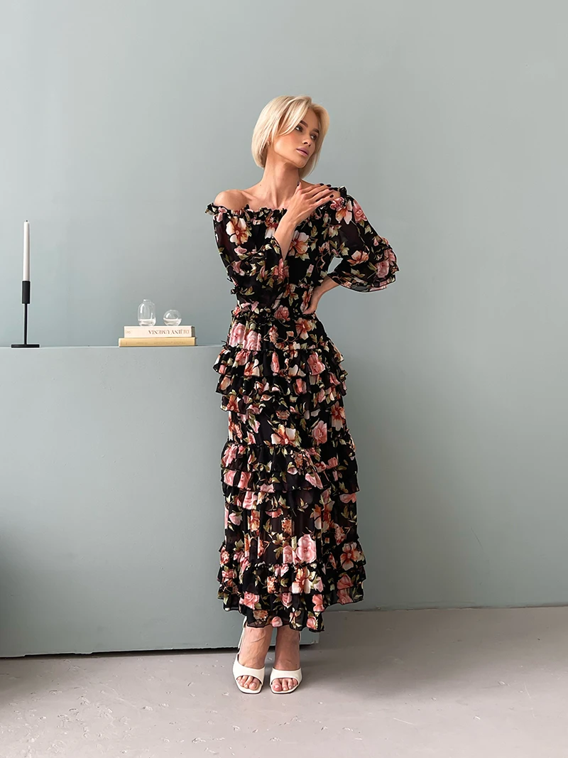 Chiffon Floral Ruffle Pleated Women Long Dresses Elegant Ladies Summer Beach Dress Long Sleeve Flower Maxi Dresses For Women