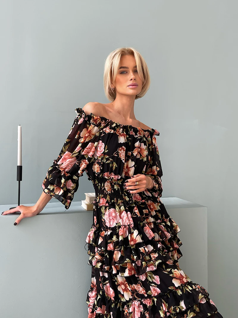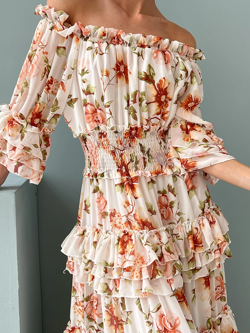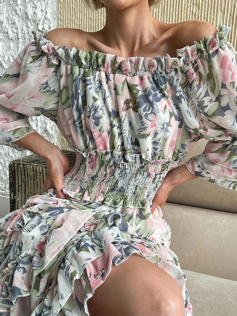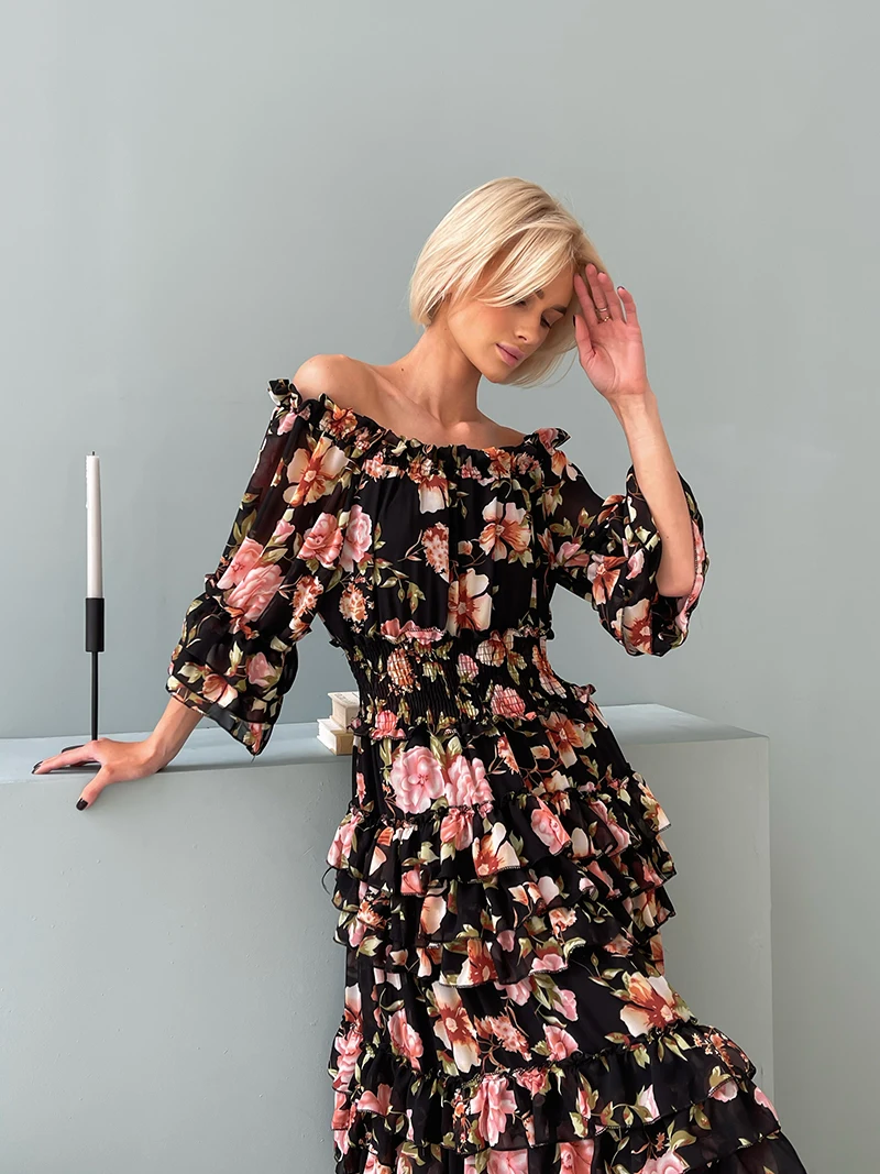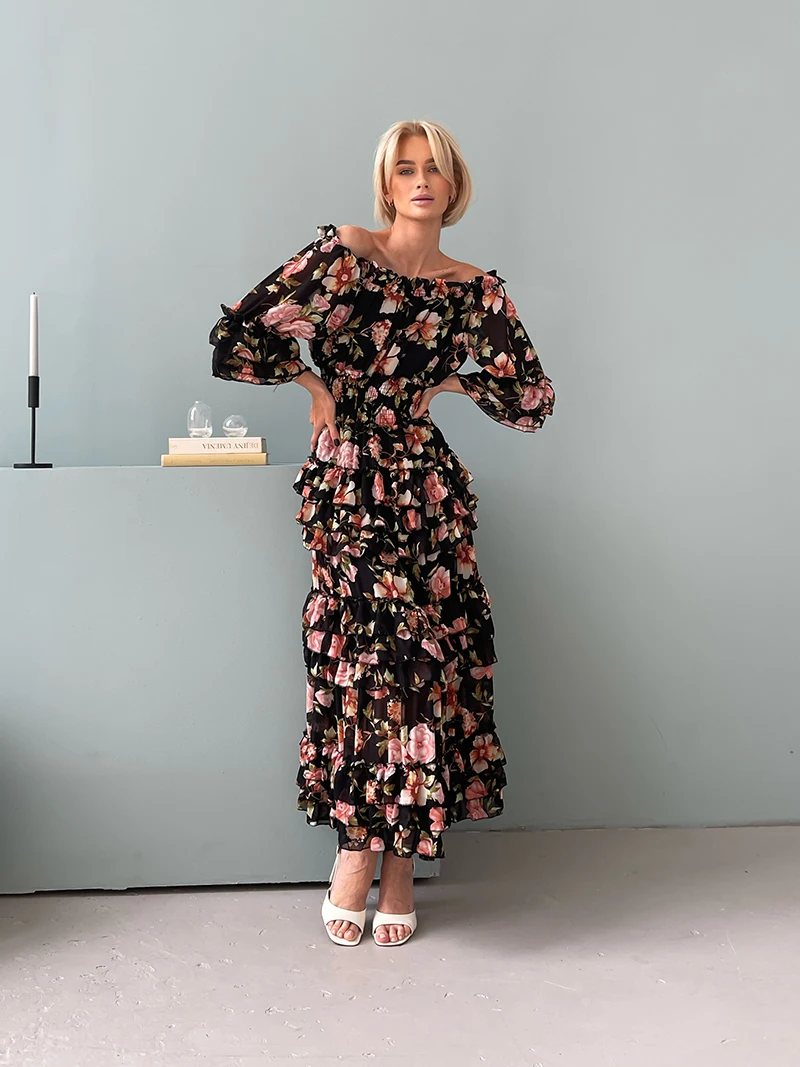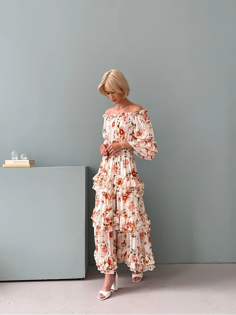 Chiffon Floral Ruffle Pleated Women Long Dresses Elegant Ladies Summer Beach Dress Long Sleeve Flower Maxi Dresses For Women