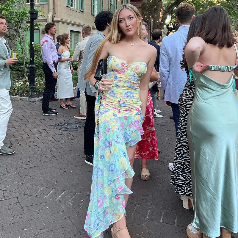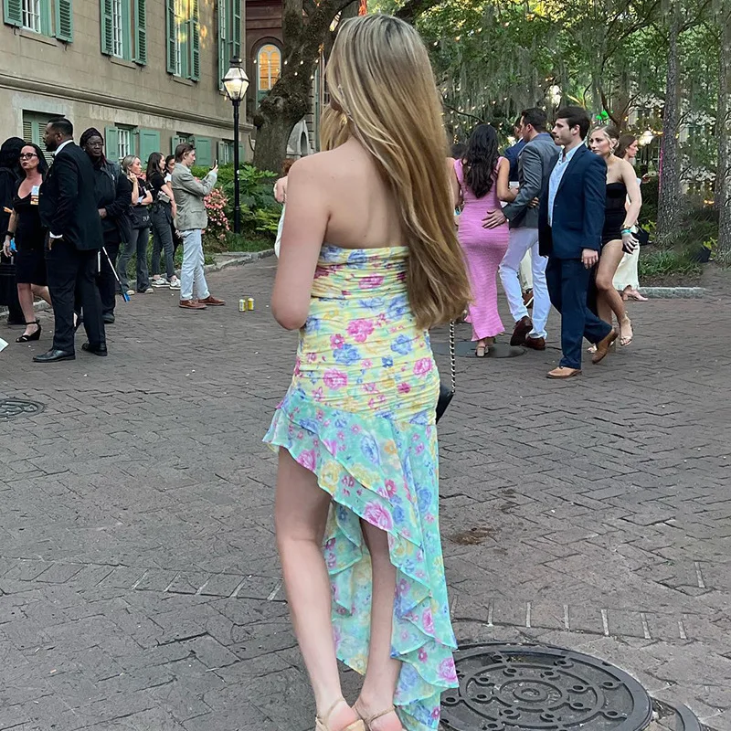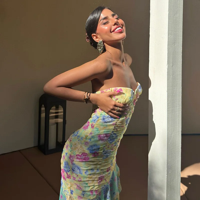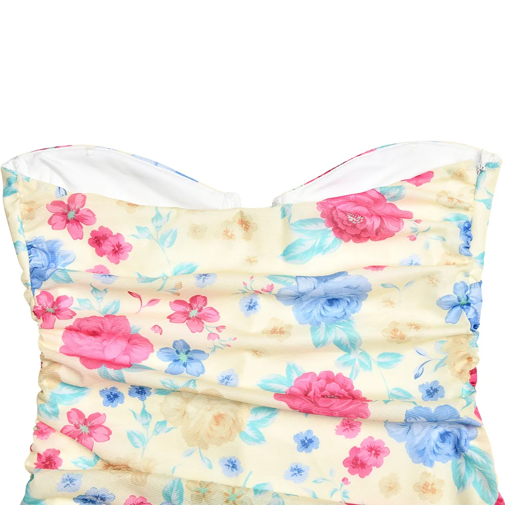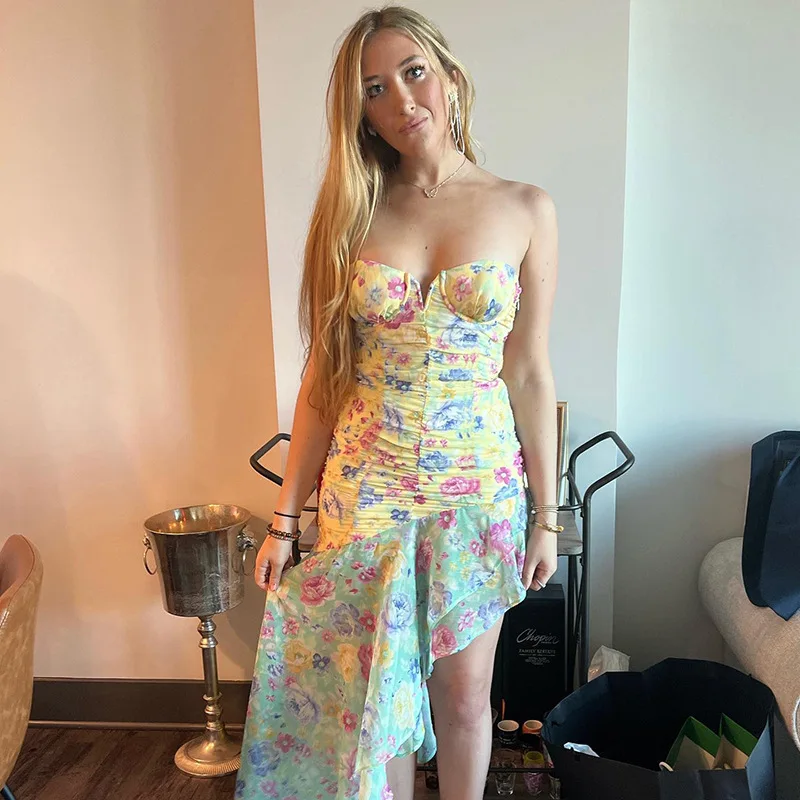 Elegant Ruched Ruffle Floral Print Midi Dresses Irregular Outfits for Women Club Party Sexy Strapless Sun Dresses