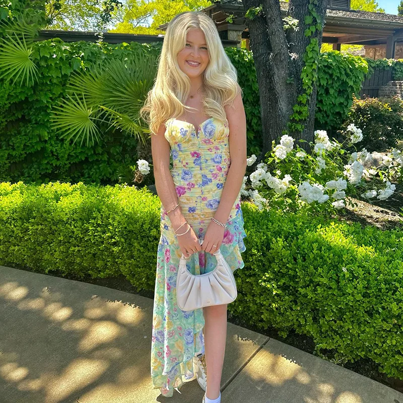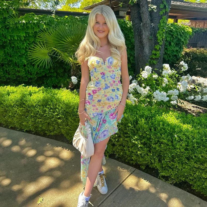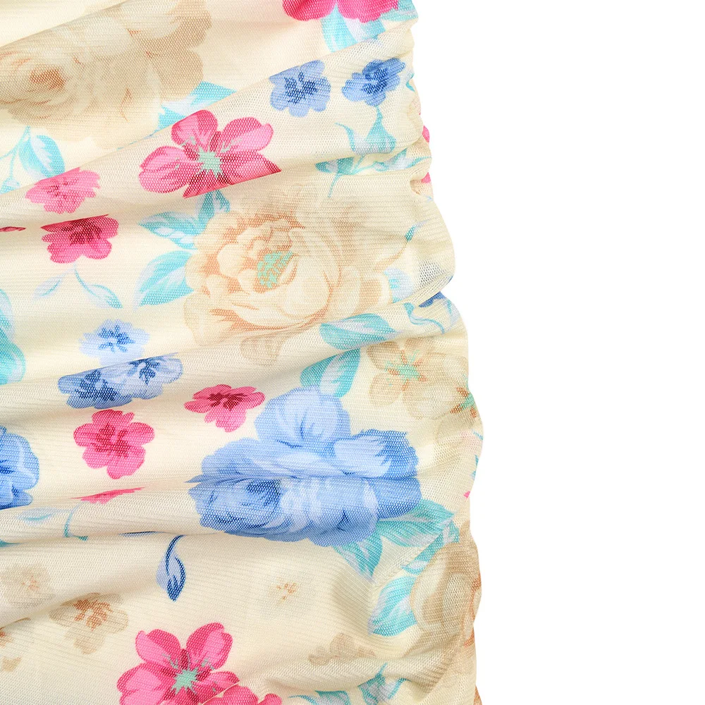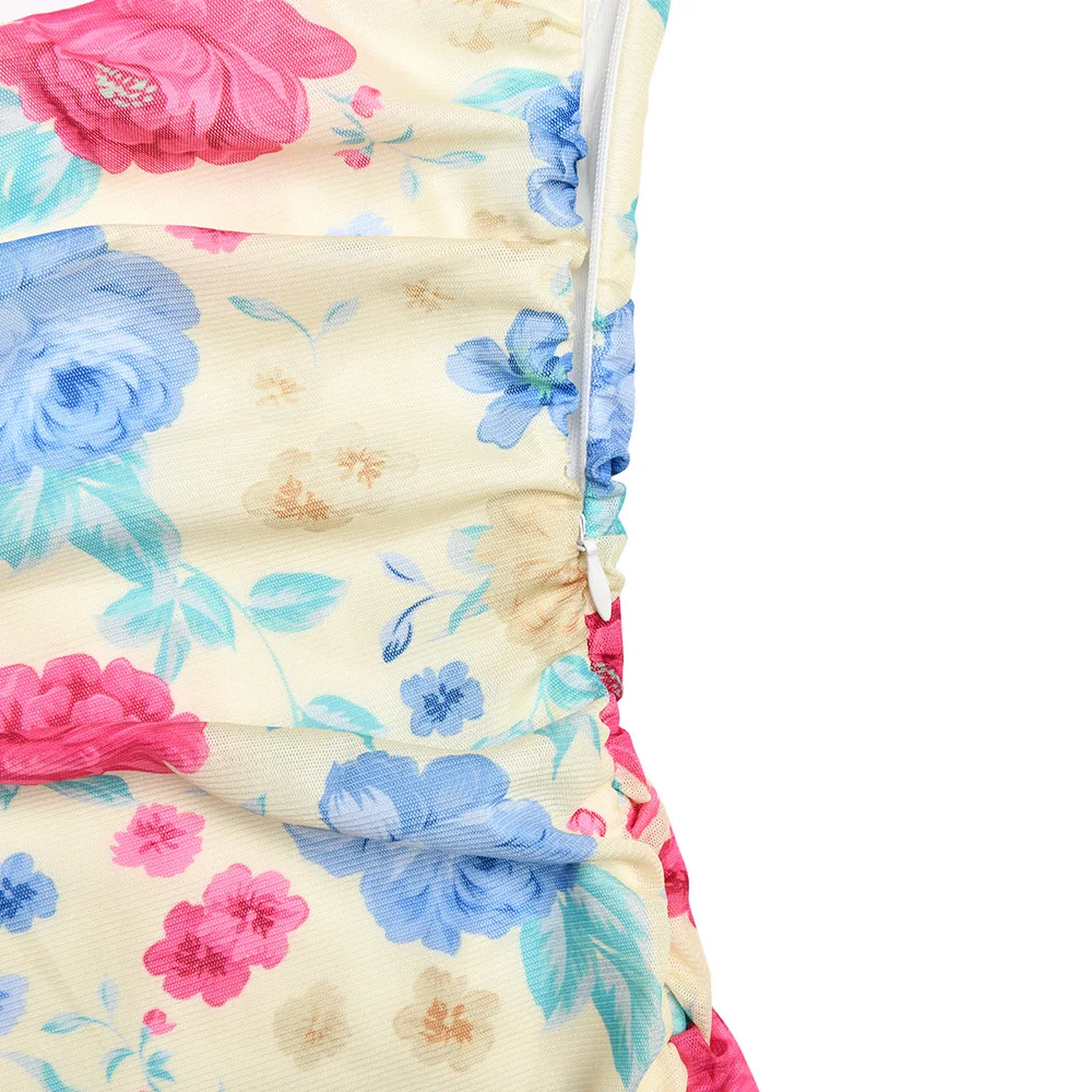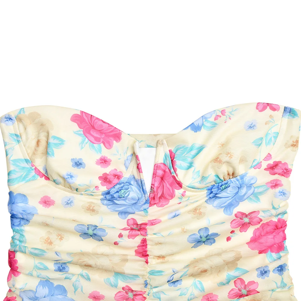 Elegant Ruched Ruffle Floral Print Midi Dresses Irregular Outfits for Women Club Party Sexy Strapless Sun Dresses
