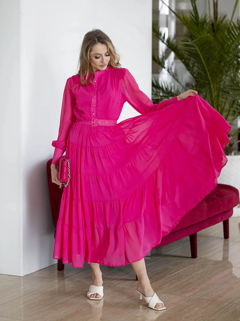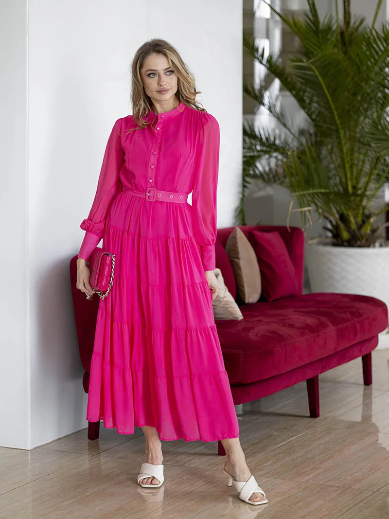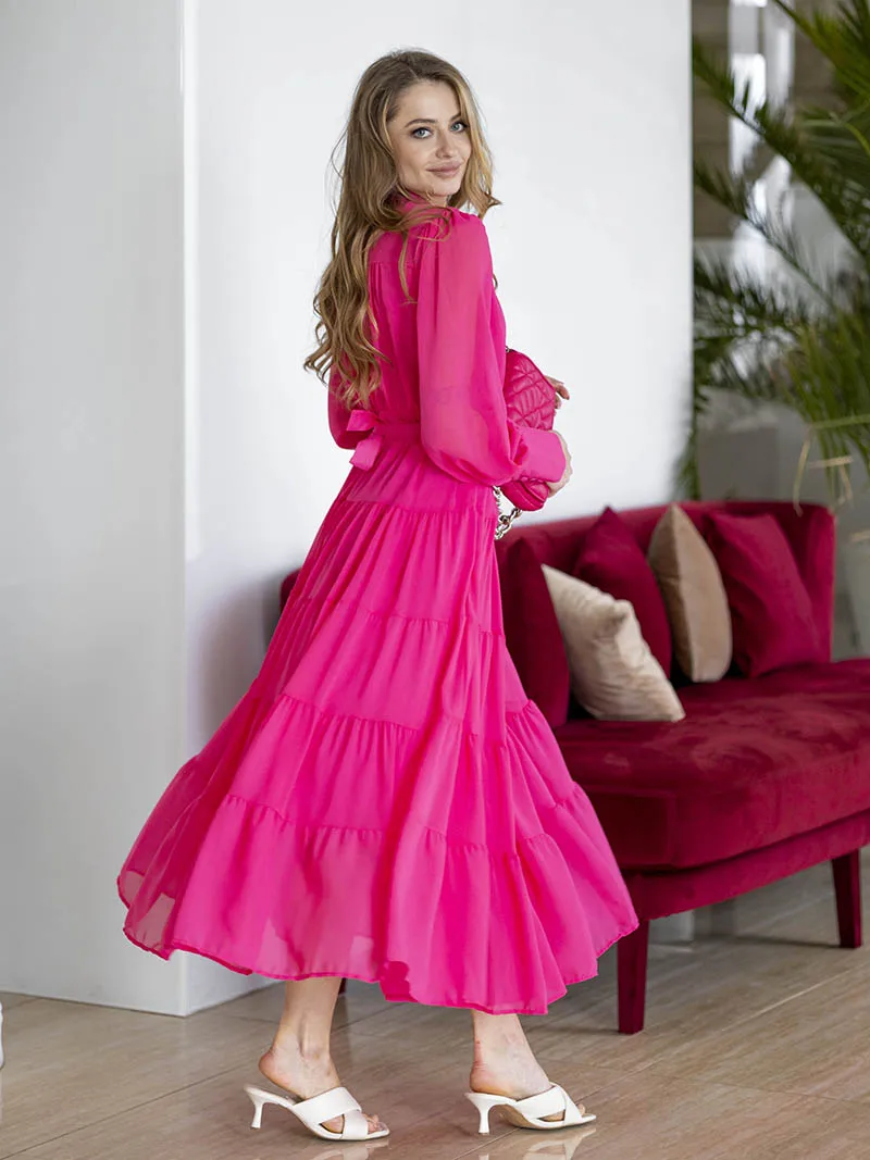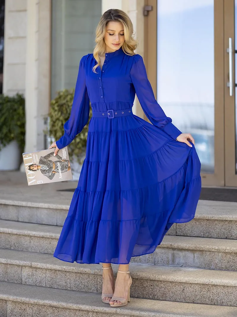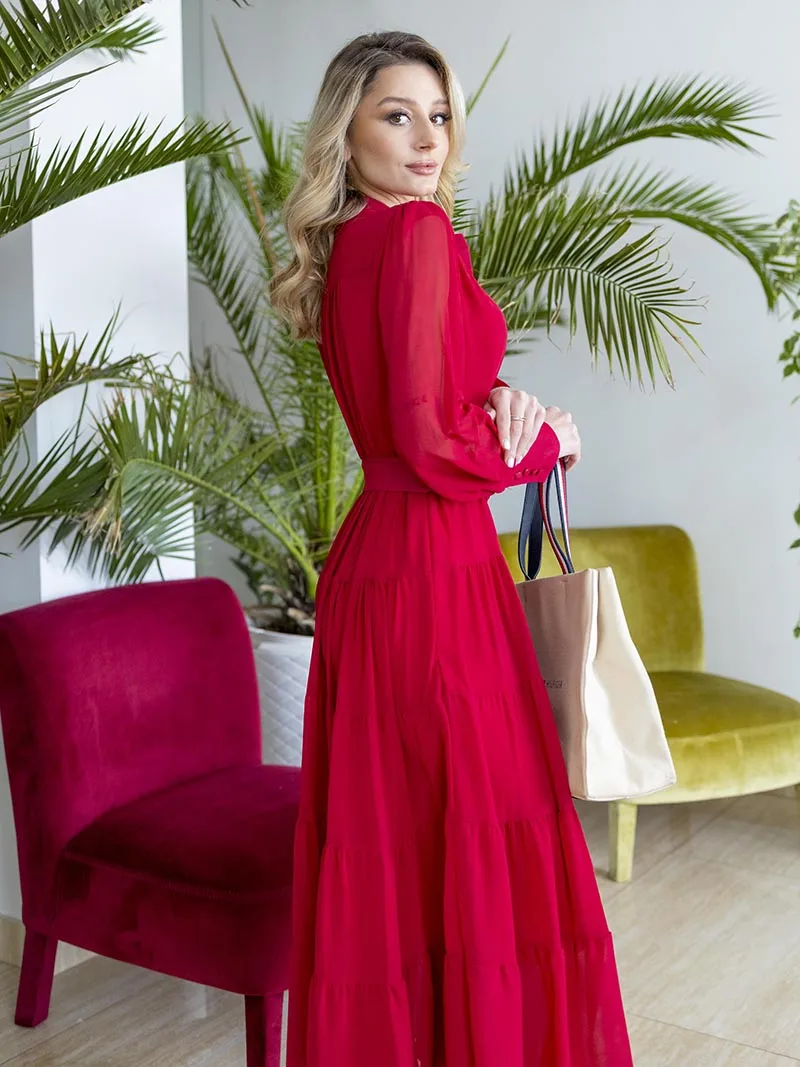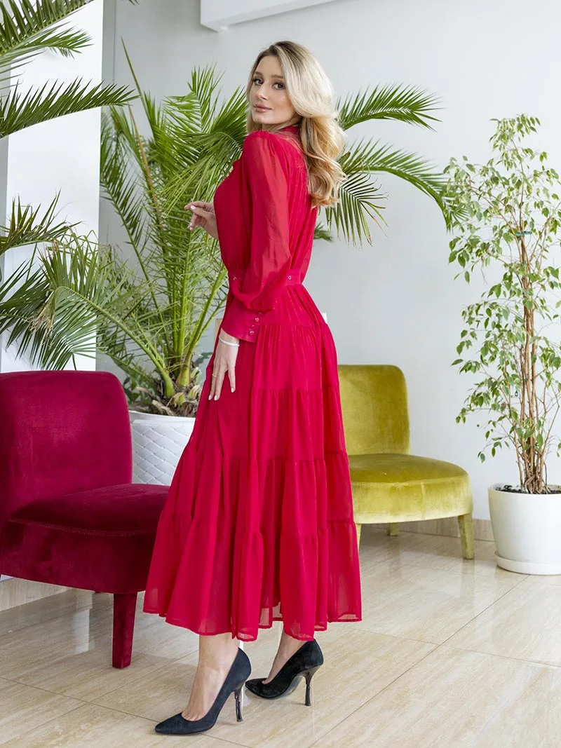 Long Sleeve Ruffle Elegant Evening Dress Blue Red Pink Pleated Maxi Prom Dress Ladies Summer Long Dress with Belt For Women 2023