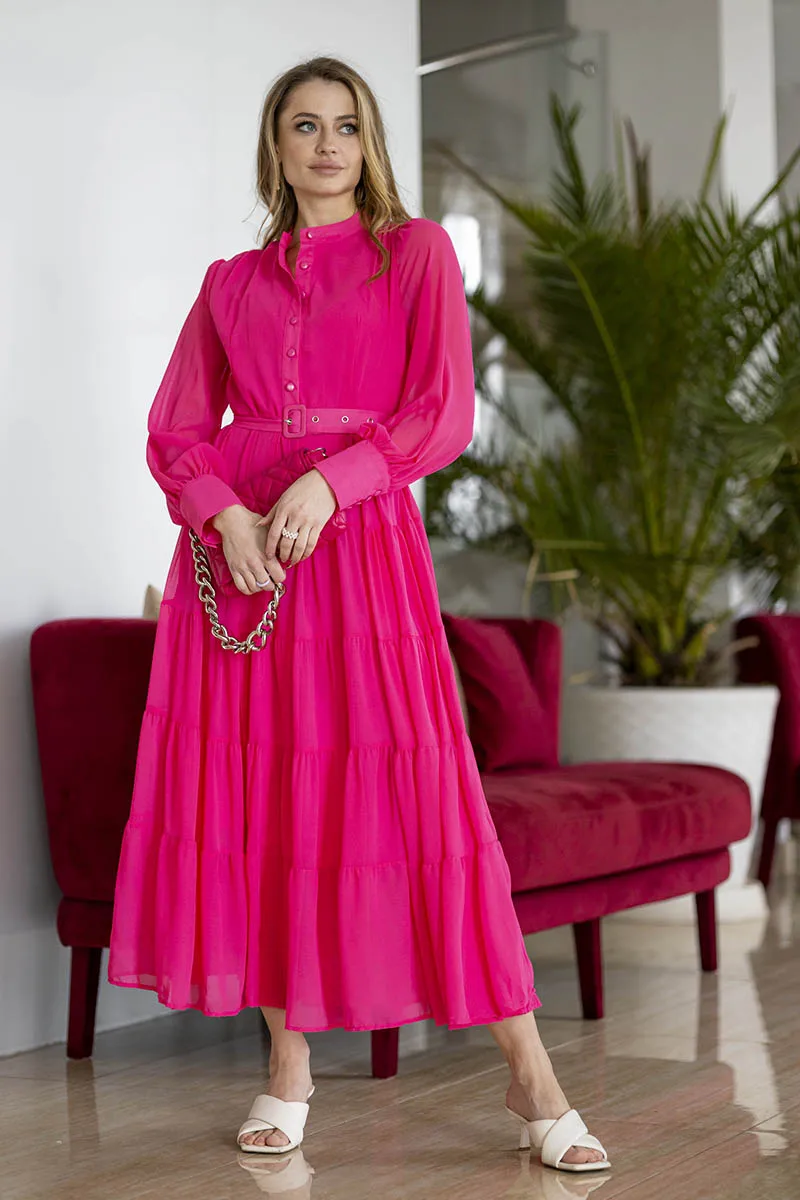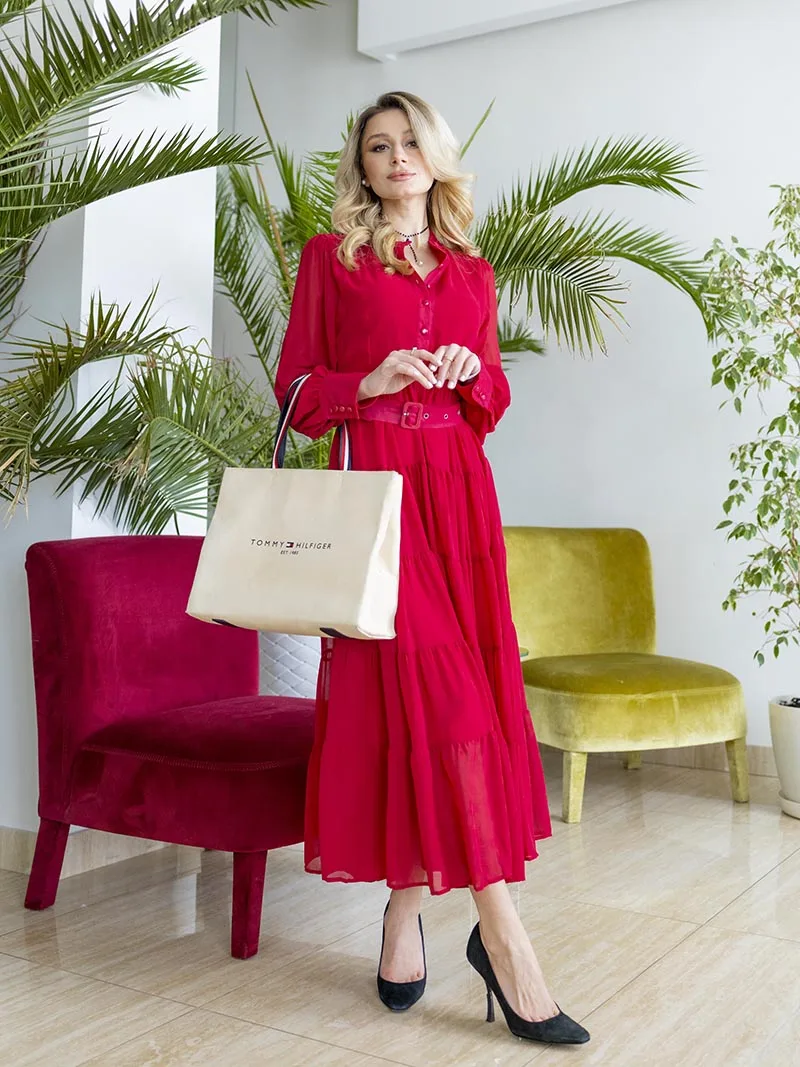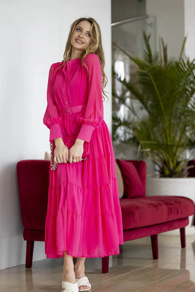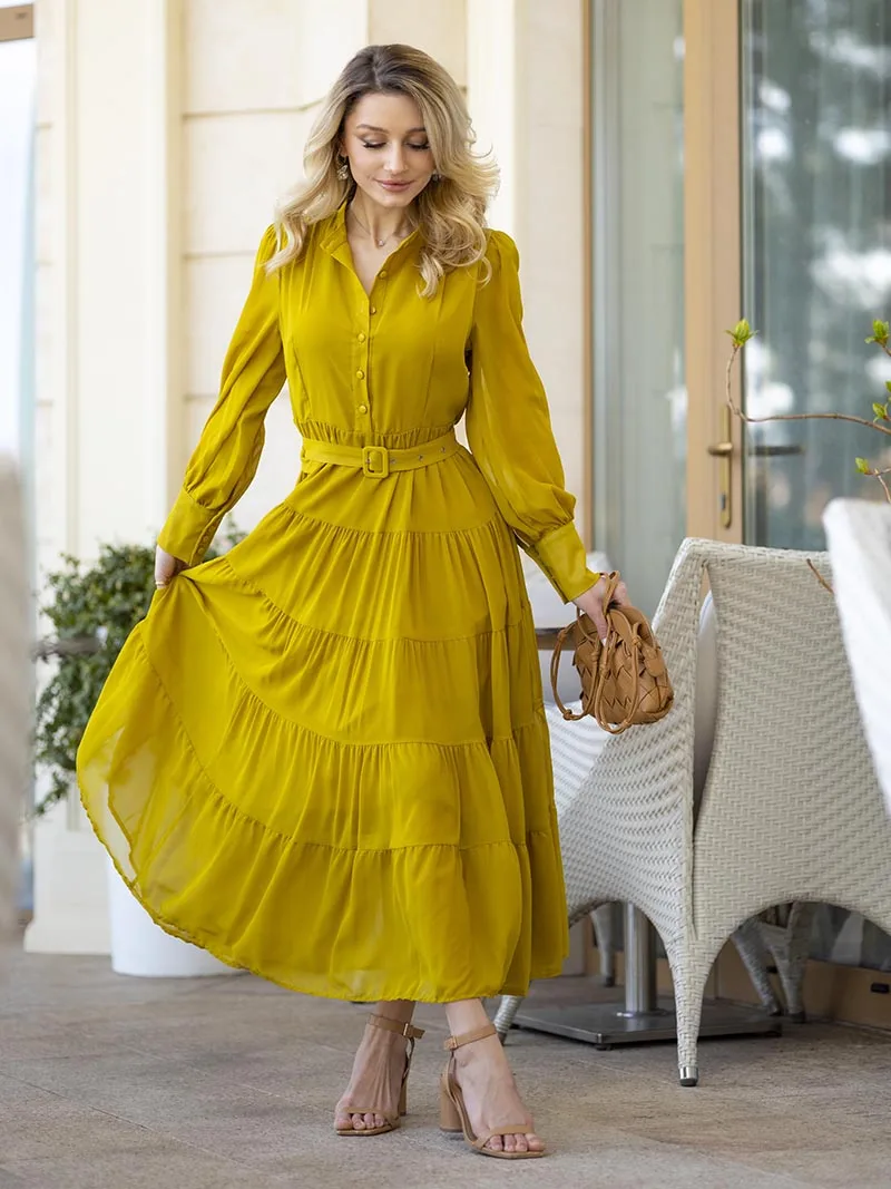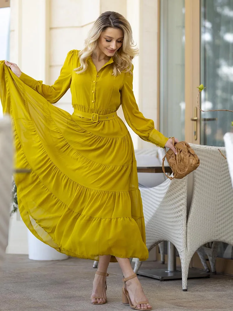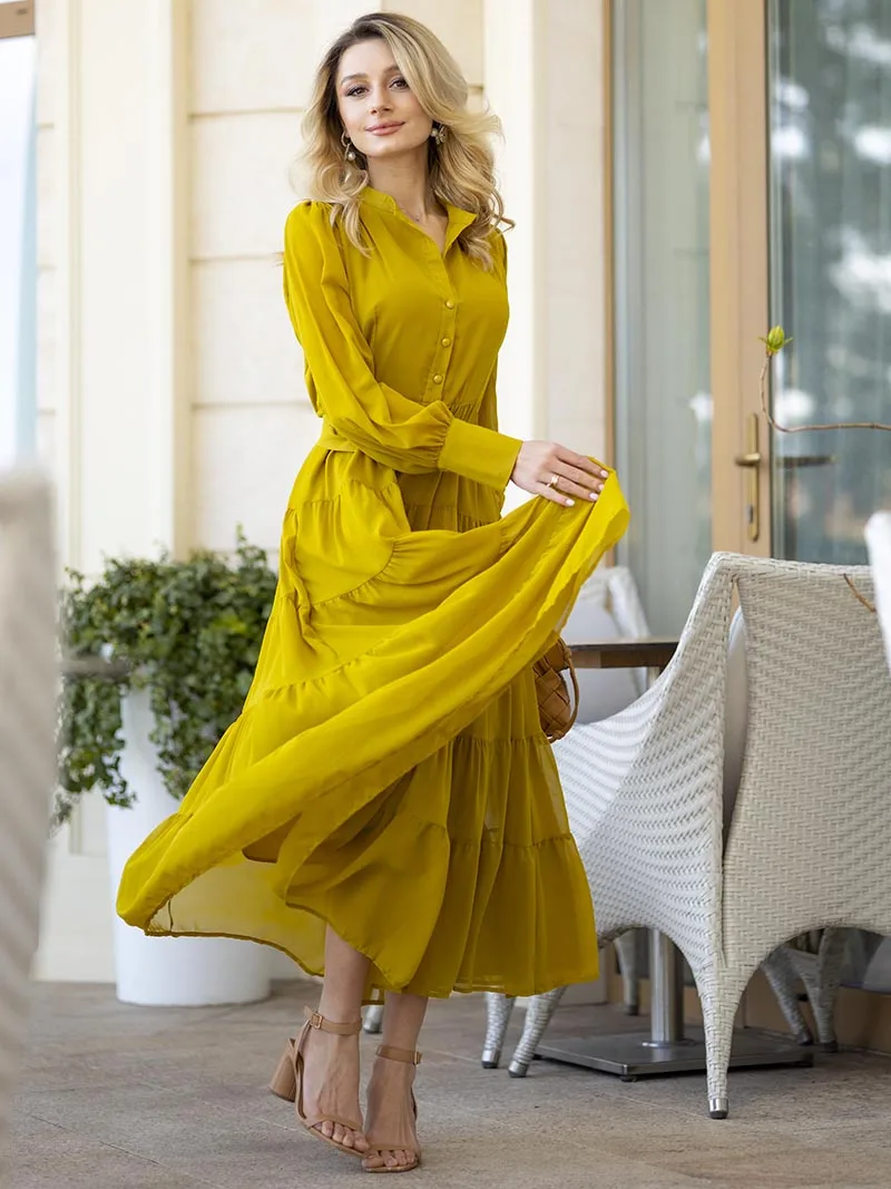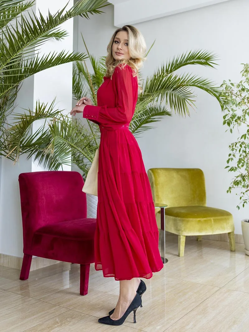 Long Sleeve Ruffle Elegant Evening Dress Blue Red Pink Pleated Maxi Prom Dress Ladies Summer Long Dress with Belt For Women 2023