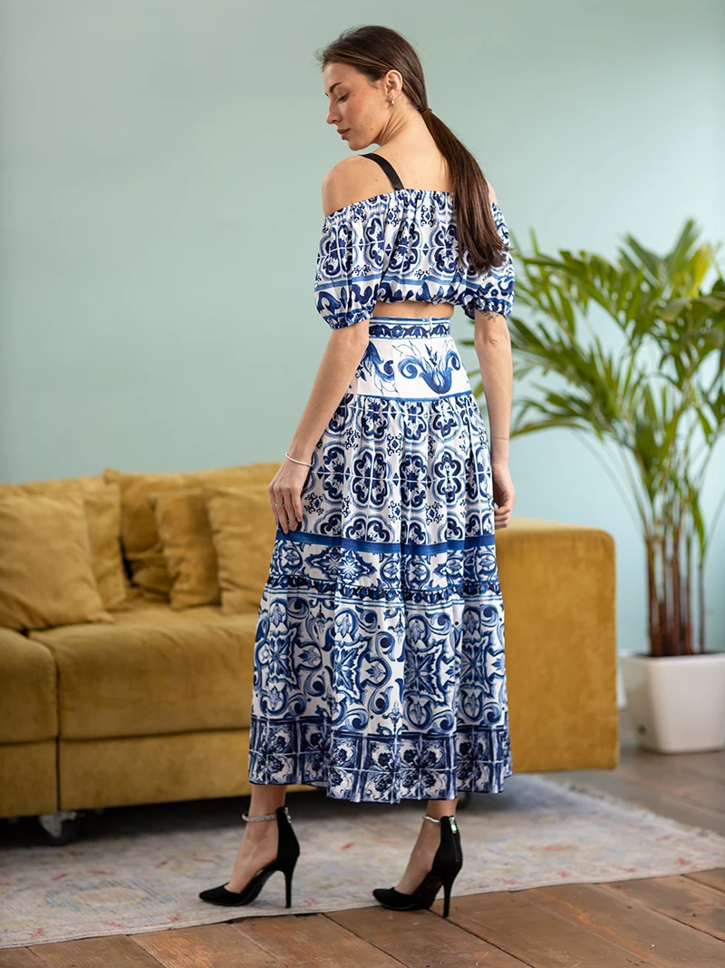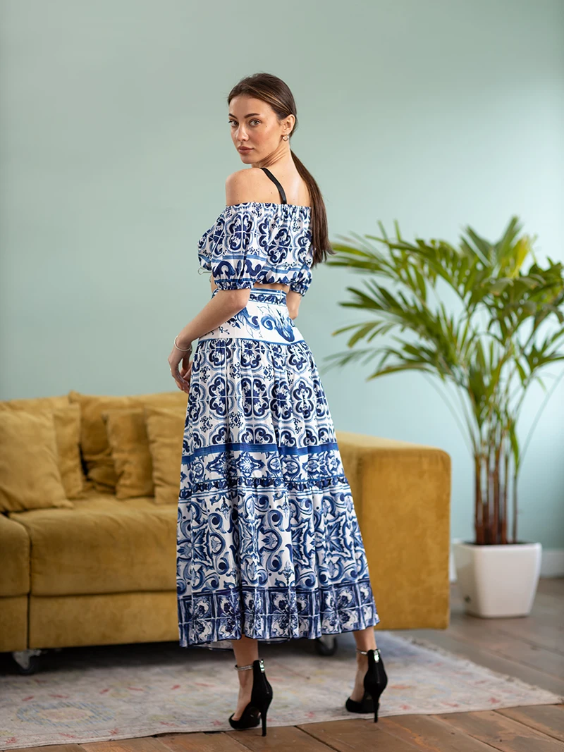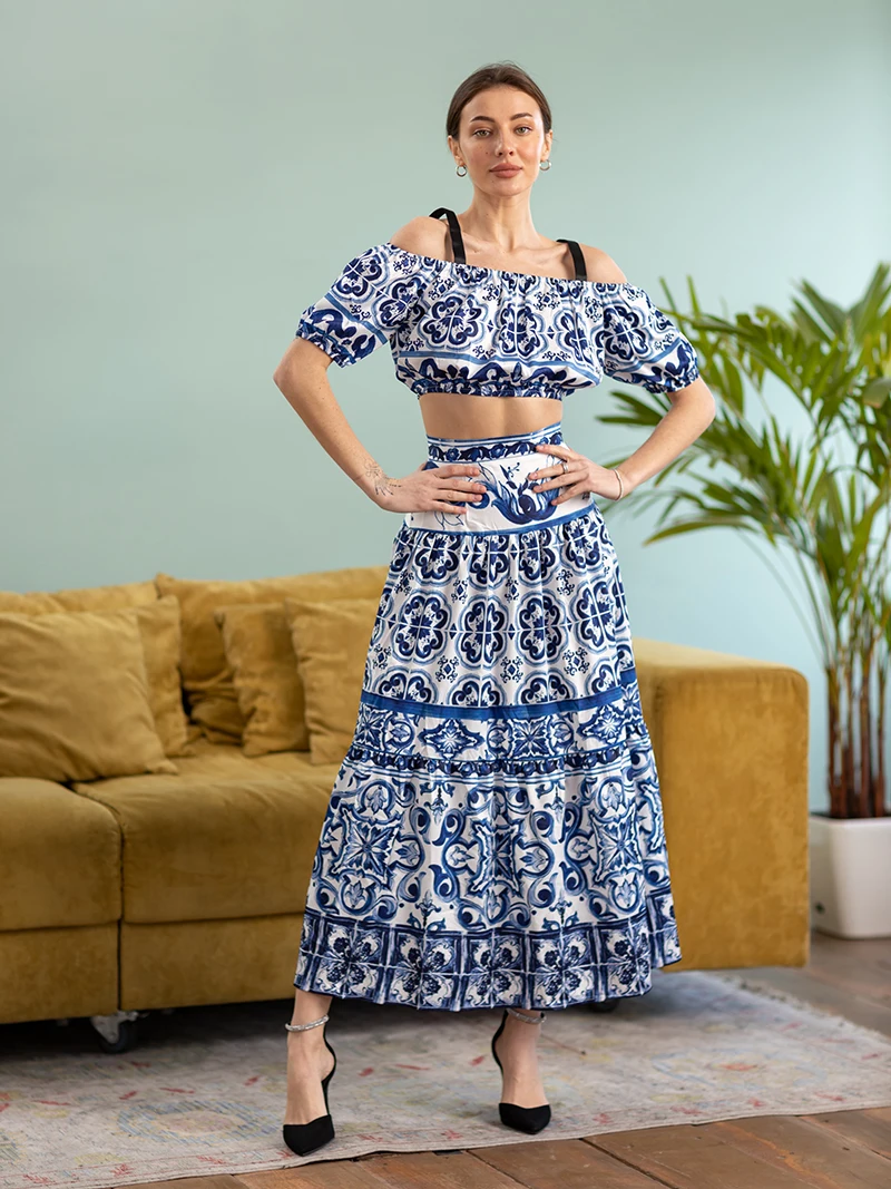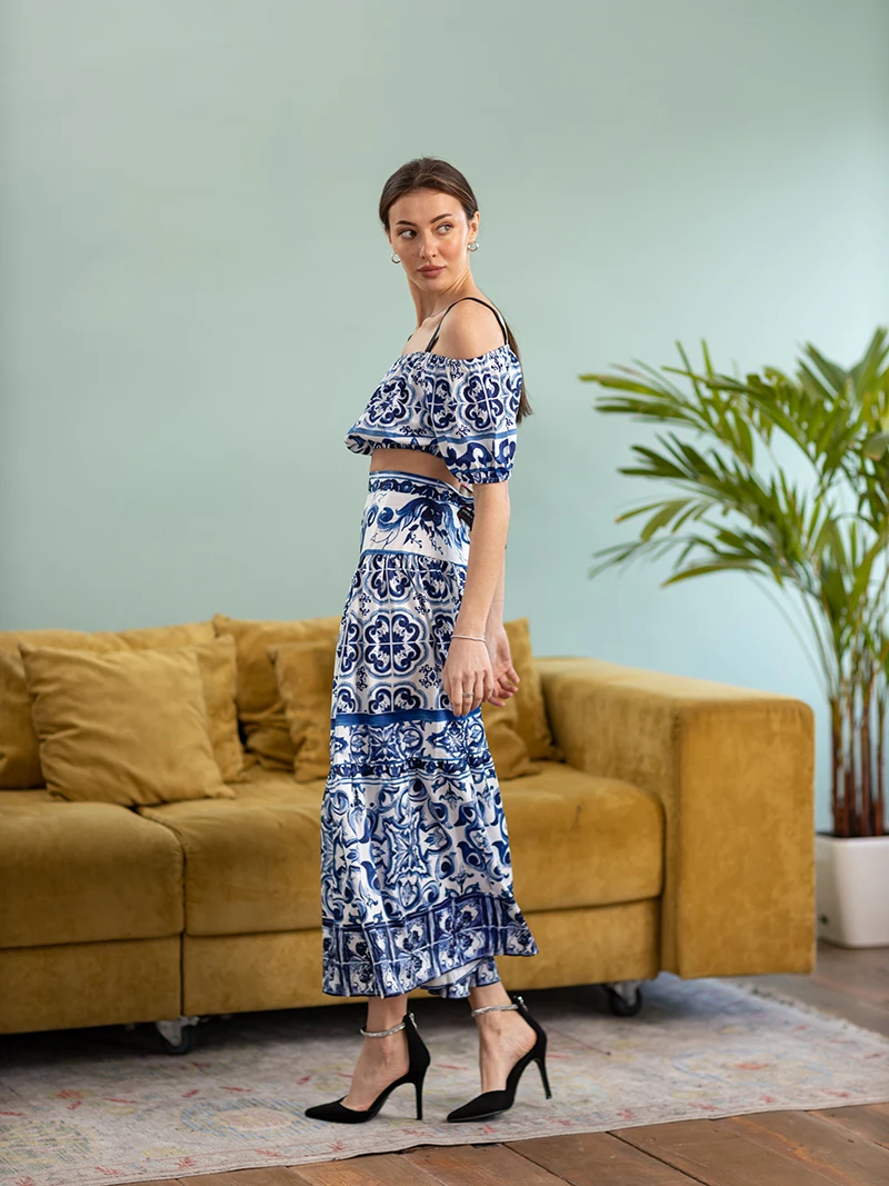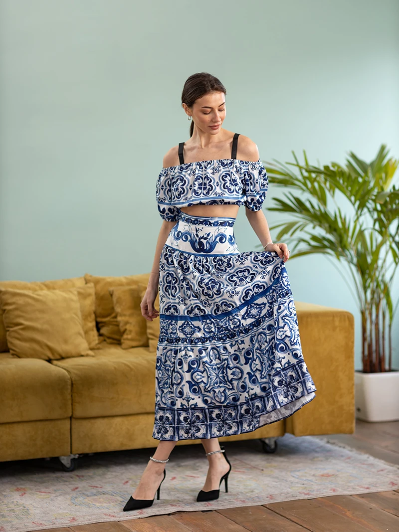 Blue White Chiffon 2 Piece Set Skirt and Top Elegant Two Piece Skirt Set Women Sexy Beach Summer Vacation Outfit For Women