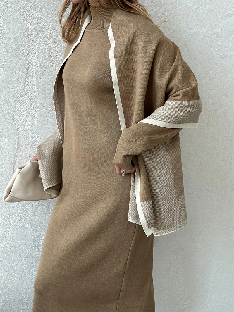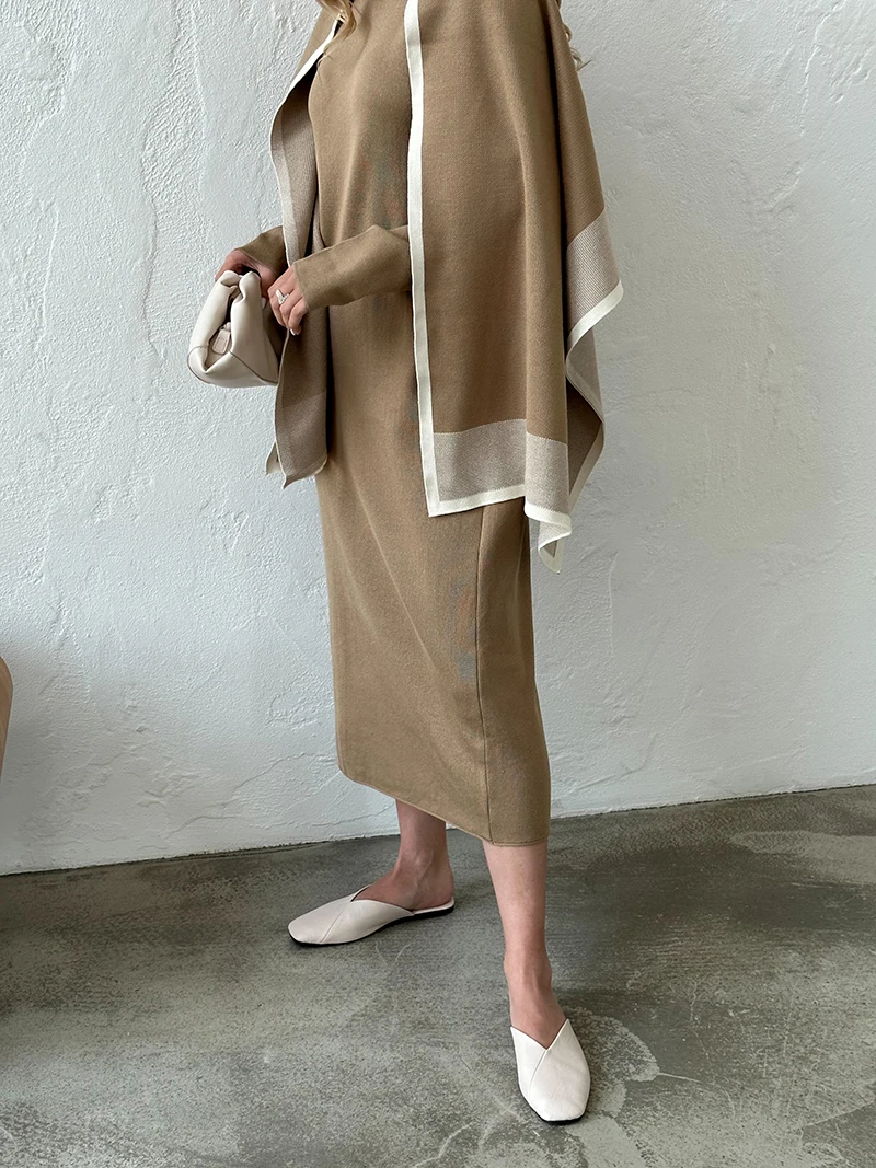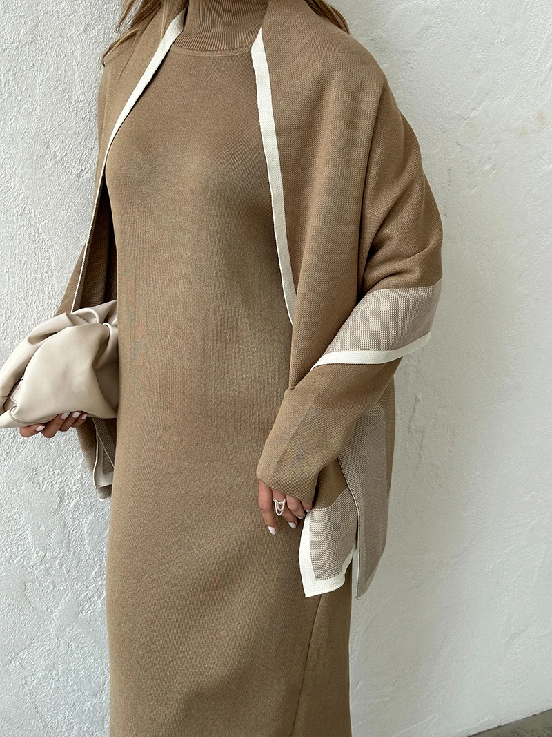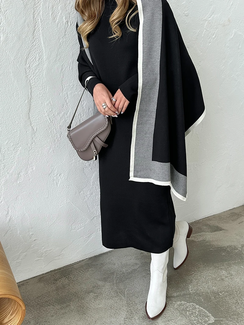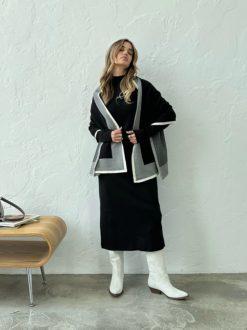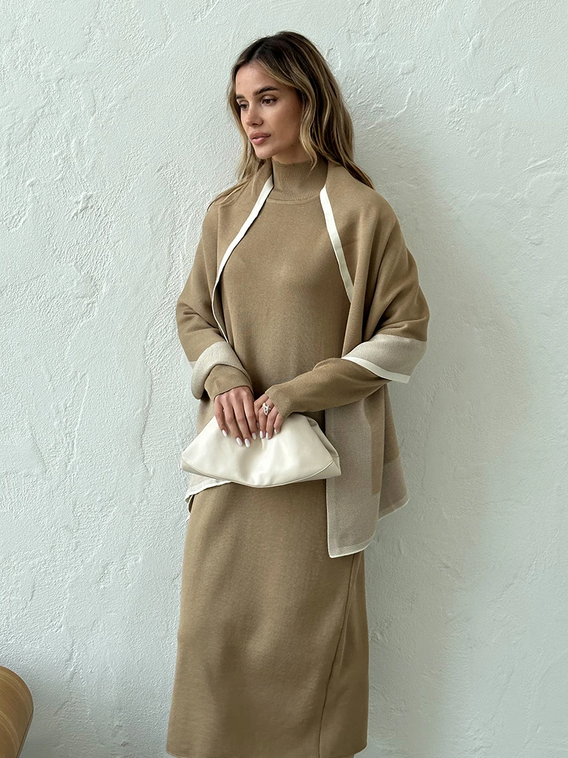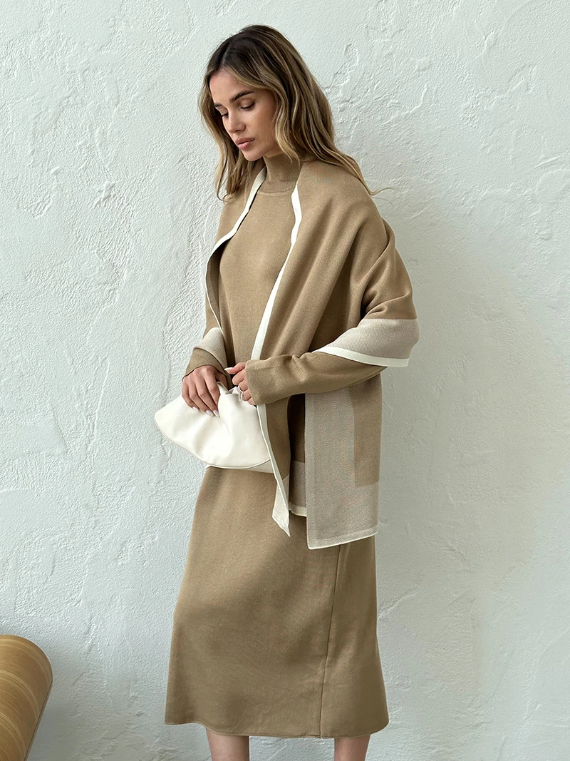 Elegant Knit Two Piece Set Black Brown Shawl Dress Women Knit Suit 2 Piece Sets Women Outfit Winter Knitted Two Piece Women Sets