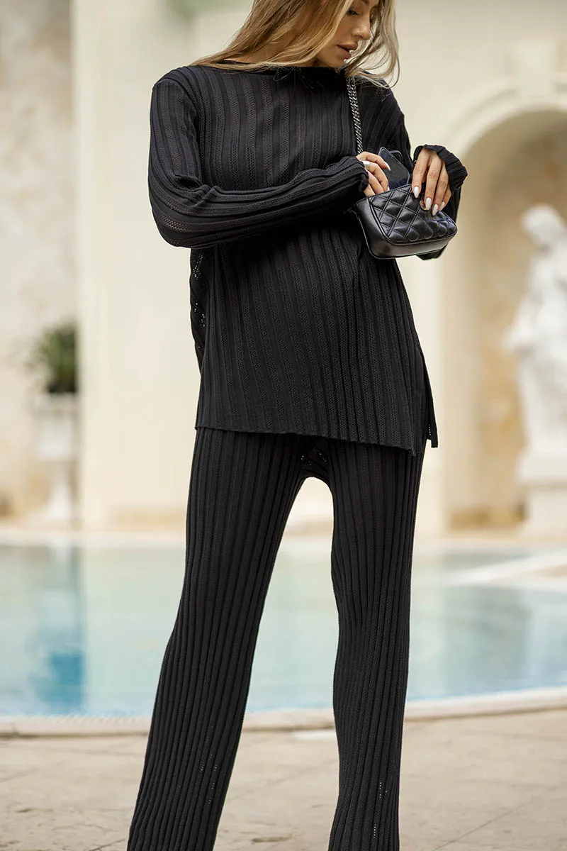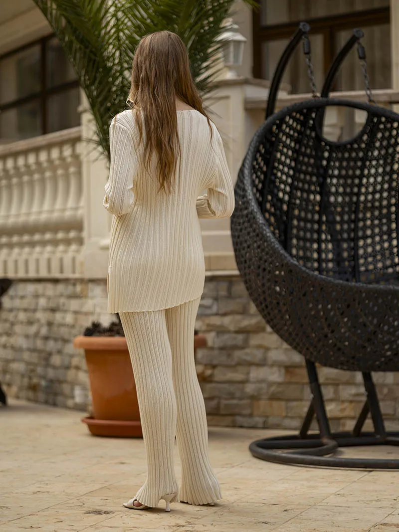 Elevate your casual wardrobe with our Ribbed Knit Two Piece Set for Women. This set includes a long sleeve top and matching pants, both made from high-quality ribbed knit fabric.