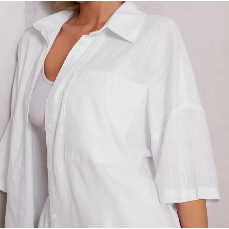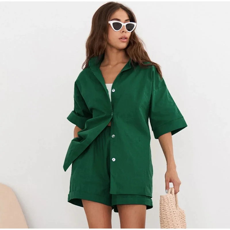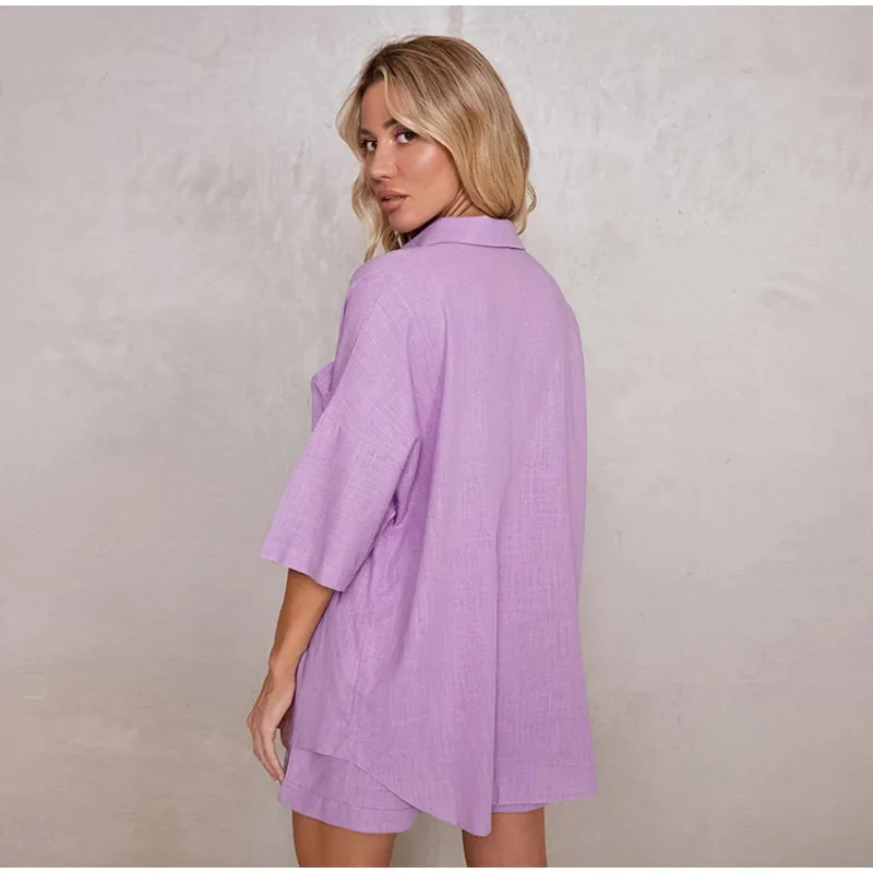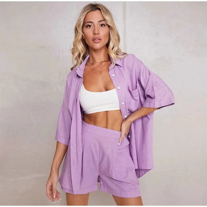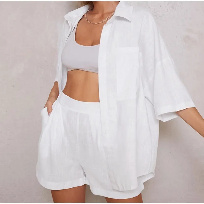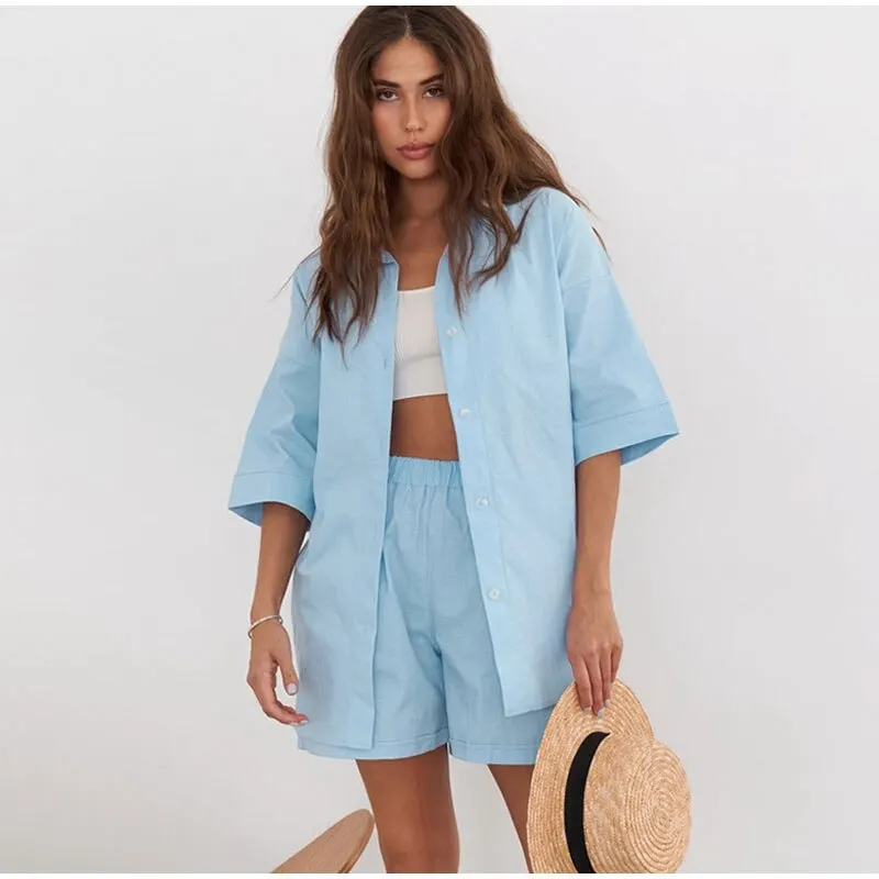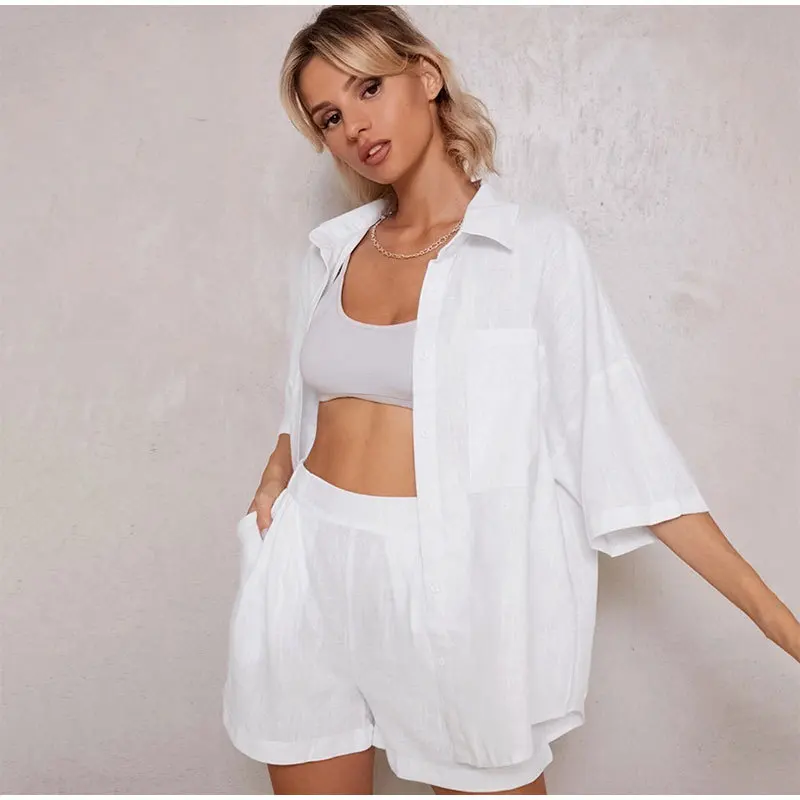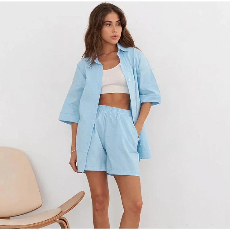 Elevate your summer style with our Fashion Summer Two-Piece Set for women. This set features a short sleeve shirt and loose shorts, perfect for a casual and chic look. The long blouse adds a touch of sophistication, while the pockets provide practicality.