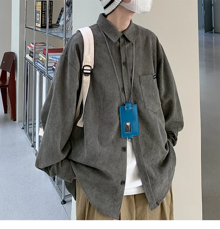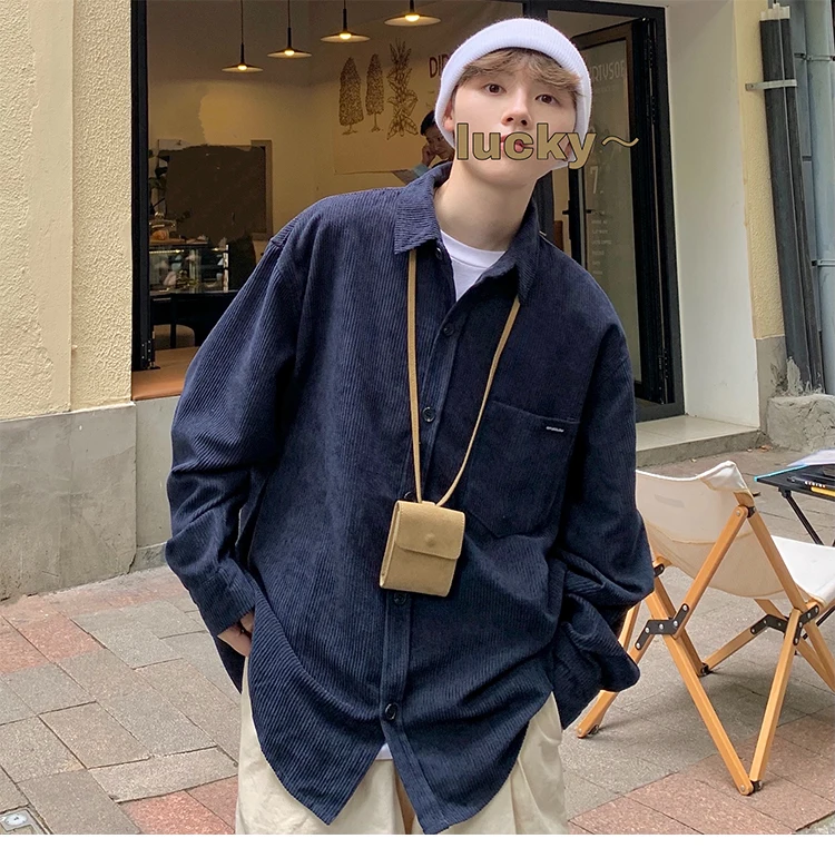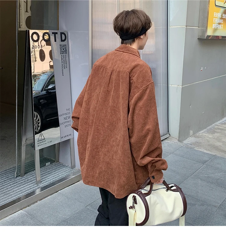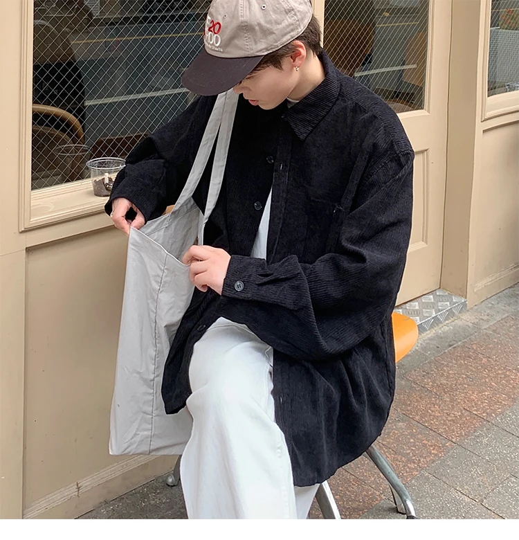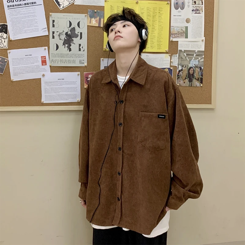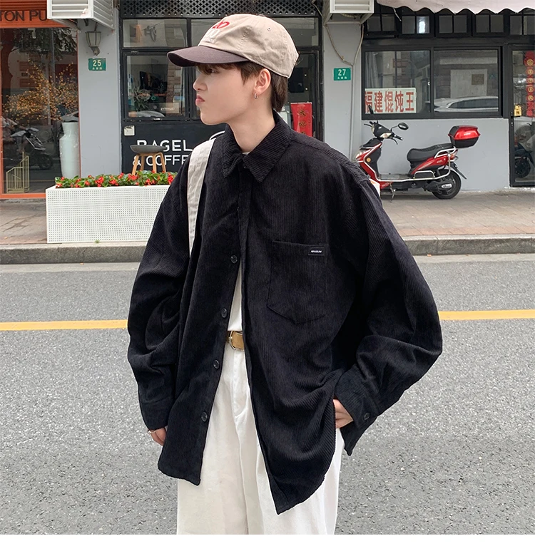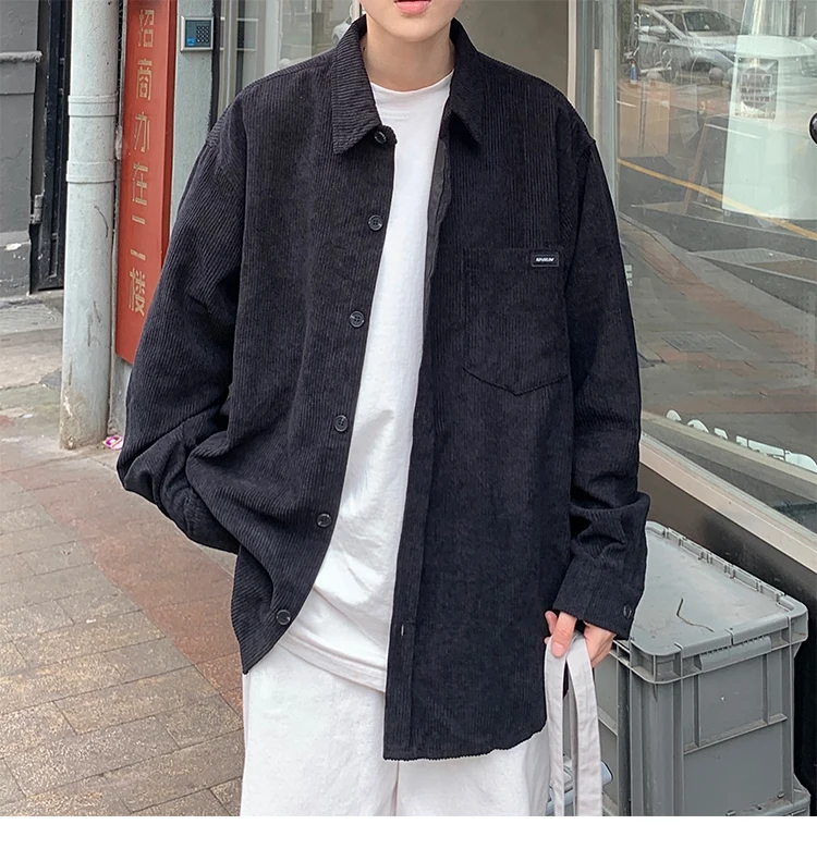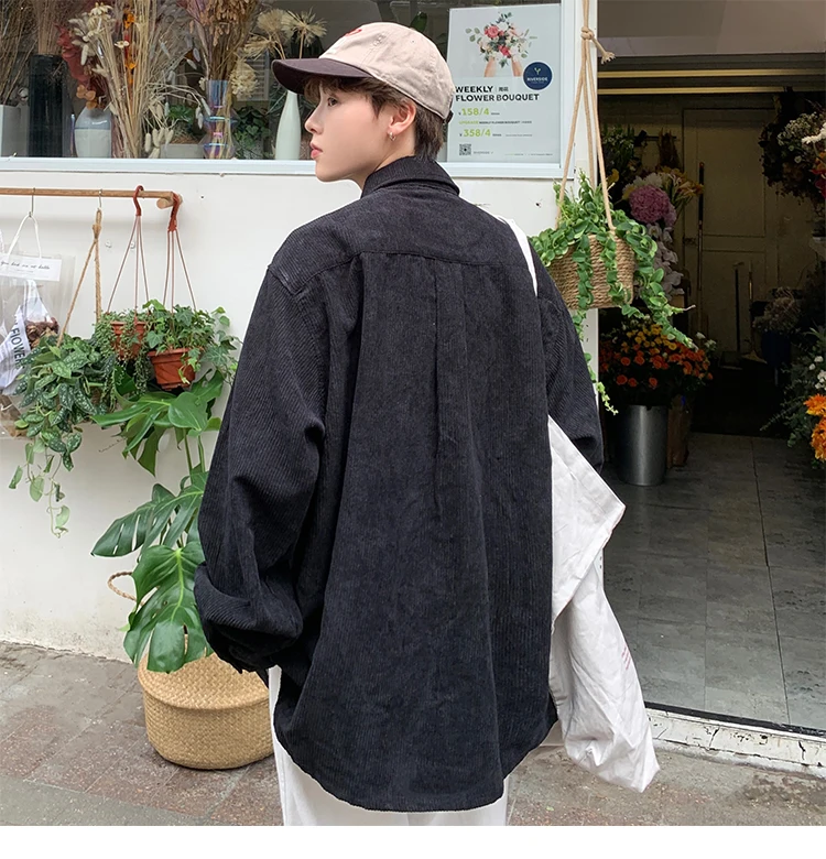 Men Corduroy Vintage Harajuku Shirts 2023 Autumn Mens Korean Fashions Button Up Shirts Male Long Sleeve Black Shirt 2XL